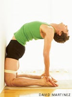 Backbends require maximal extension of the hip joints. Extension is the action of opening the hip joint in front. To understand this action, move into a lunging pose like Virabhadrasana I (Warrior Pose I). The hip joint of your back leg is in extension. In order to achieve extension, the hip flexors have to stretch. The primary hip flexor is the iliopsoas muscle. The top end of the iliopsoas attaches to the lower spine and upper front pelvis, while the bottom end attaches to a bony projection on the upper inner thighbone (the lesser trochanter). When you extend your hip, you lengthen the iliopsoas. If the muscle is tight, it prevents your hip from extending as far as it should and instead pulls your lower spine and upper pelvis forward. This exaggerates the arch of your lower back and creates the painful and all-too-familiar lumbar pinch.