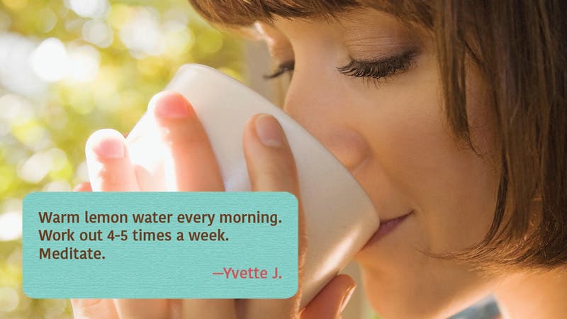 Warm lemon water every morning. Workout 4-5 times a week. Meditate.”