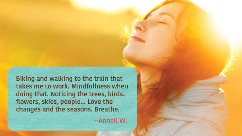 Biking and walking to the train thats takes me to work. Mindfullness when doing that. Noticing the trees, birds, flowers, skies, people, different lights, the colours of the water, snow, rain and sun. Love the changes and the seasons. Breathe.”