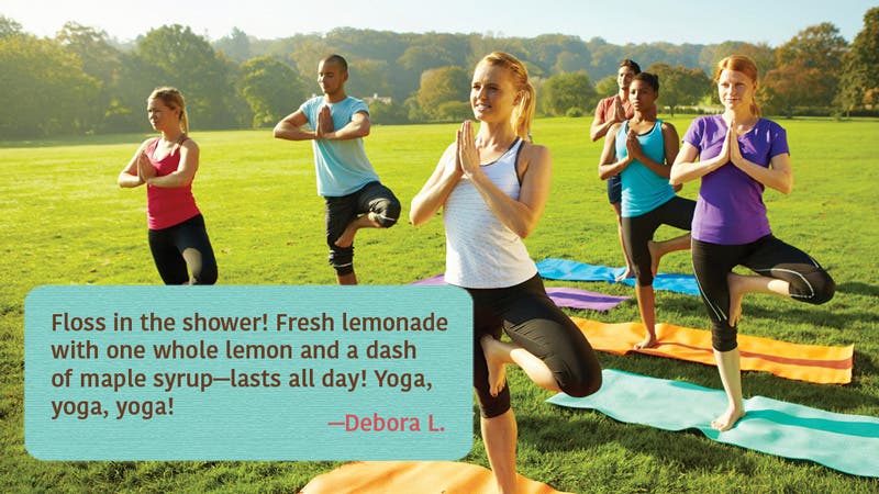 Floss in the shower! Fresh lemonade with one whole lemon and a dash of maple syrup – lasts all day! Yoga, yoga, yoga!”