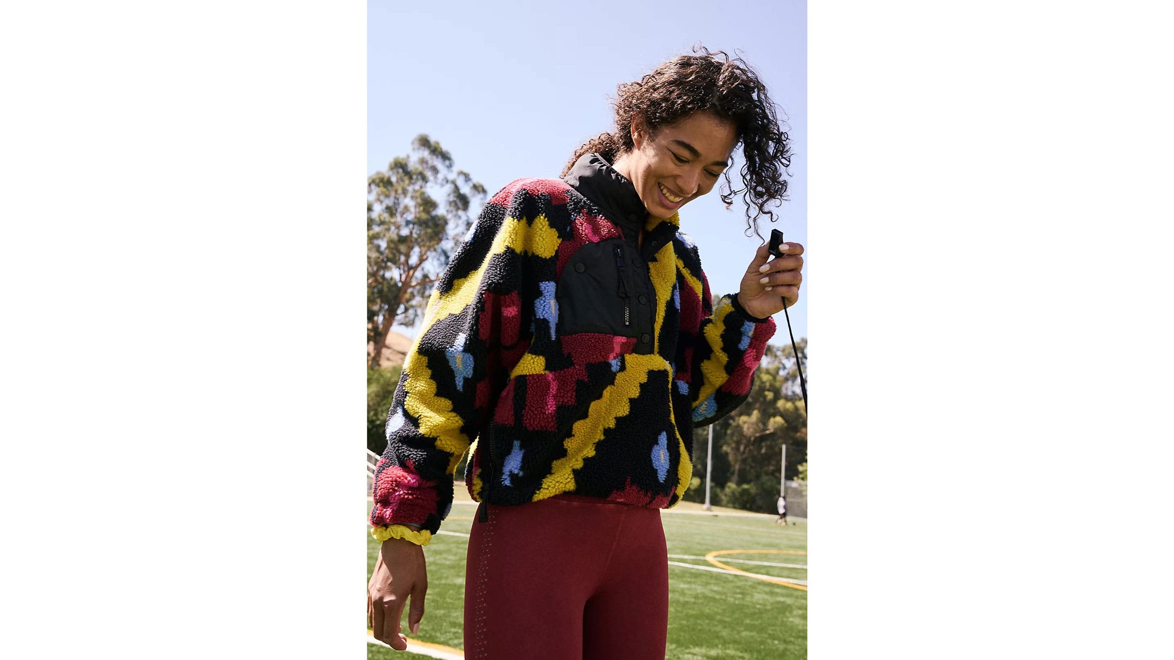 It’s tricky to find the “right” way to bundle up for the 12-minute walk (or the 8-minute I’m-running-late-jog) to my yoga studio this time of year. Coats often leave me sweating but lightweight fleece leaves me shivering. This pullover is my go-to. I frequently receive compliments on the fun, printed design of the sweatshirt and the lined interior and fuzzy exterior keep me warm.