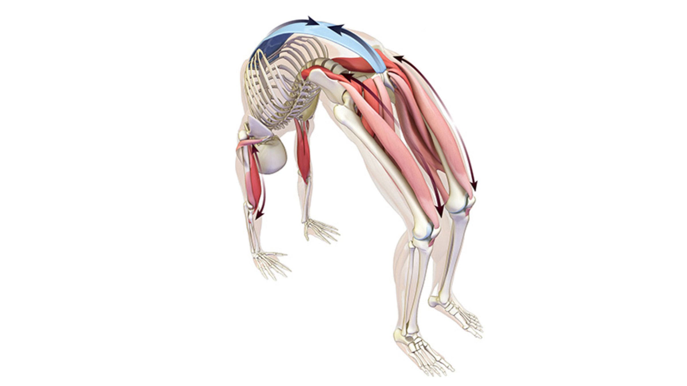 Urdhva Dhanurasana creates a backbend with your shoulders fully flexed over your head. This differs from Dhanurasana (Bow Pose), in which your shoulders extend back away from your torso, explains Ray Long, MD, a board-certified orthopedic surgeon and yoga teacher. The muscles that extend your arms in Bow Pose lengthen in Wheel Pose or Upward-Facing Bow Pose. Compared to Bow Pose, in Upward-Facing Bow, your torso is arched higher, taking the front of the body into a deeper stretch. The muscles at the front of your pelvis lengthen more because your hips are in greater extension. Your hands and feet are fixed to the mat, so the energy of straightening the arms and legs is transferred to your trunk, indirectly extending your back and hip and stretching the front of your body.