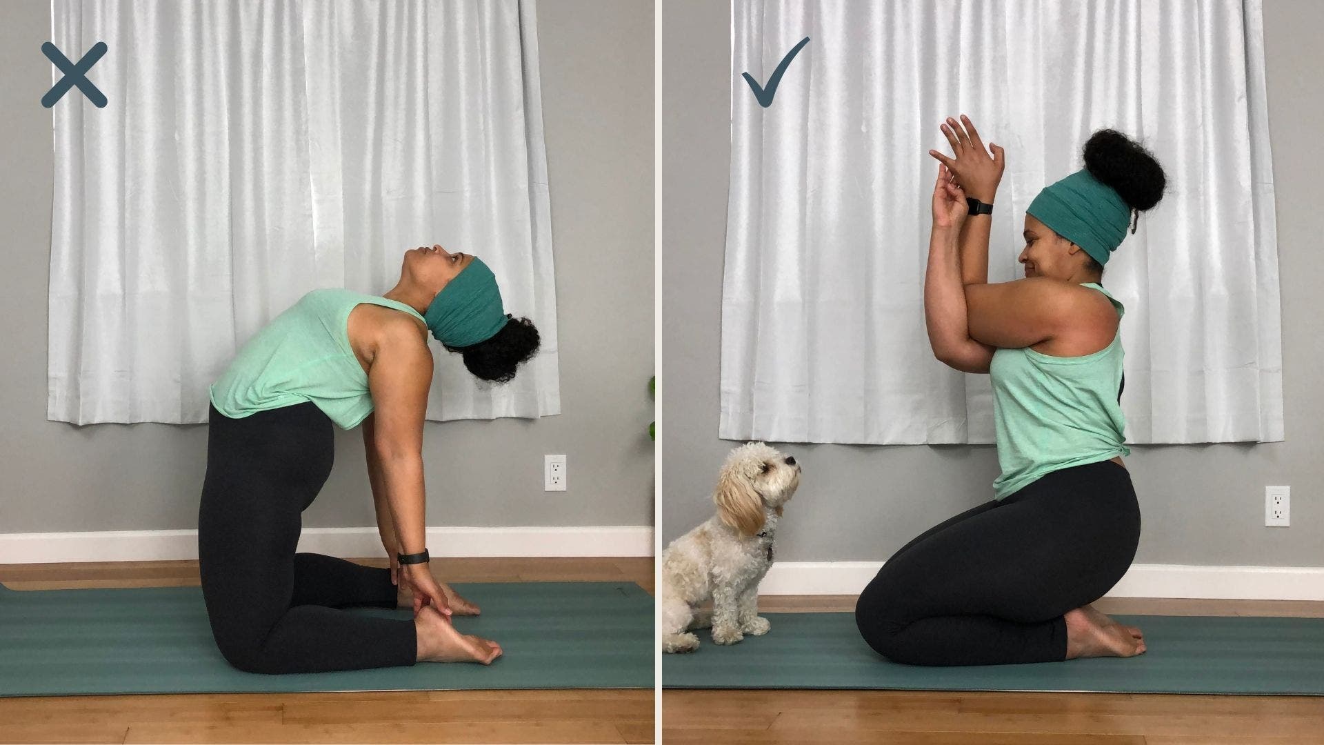 How to: Come onto your knees. Bring your knees and ankles together and sit onto your shins. When the rest of the class lifts their hips into Camel Pose, you will stay seated. Rather than following the cue to reach your arms back, reach your arms forward and cross your right elbow over your left coming into Eagle Pose. Wrap your forearms and press your palms if you’re able. If full Eagle feels like too much today, repeat the hug variation from the Constructive rest option. Switch sides on their second round.