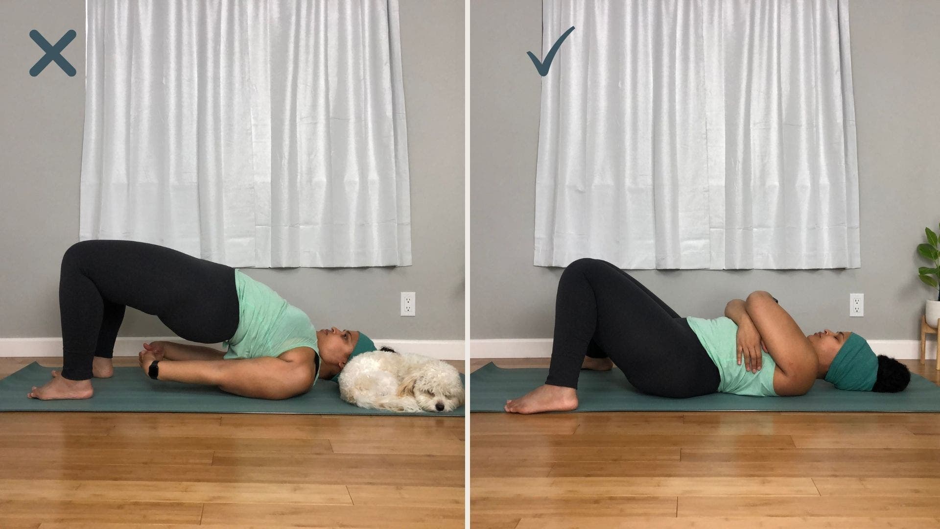 How to: Lie down on your back and bend your knees. Separate your feet as wide as your mat or wider, and let your knees rest against each other. As the rest of the class lifts their hips and interlaces their fingers behind their backs, keep your pelvis on the floor and cross your arms in front of your body. Wrap your right arm over your left, giving yourself a tight hug. Let your elbows hang heavily toward your belly button. There should be a sense of ease. Remain for as long as the class is lifted in Bridge. Switch arms when they do their second round.