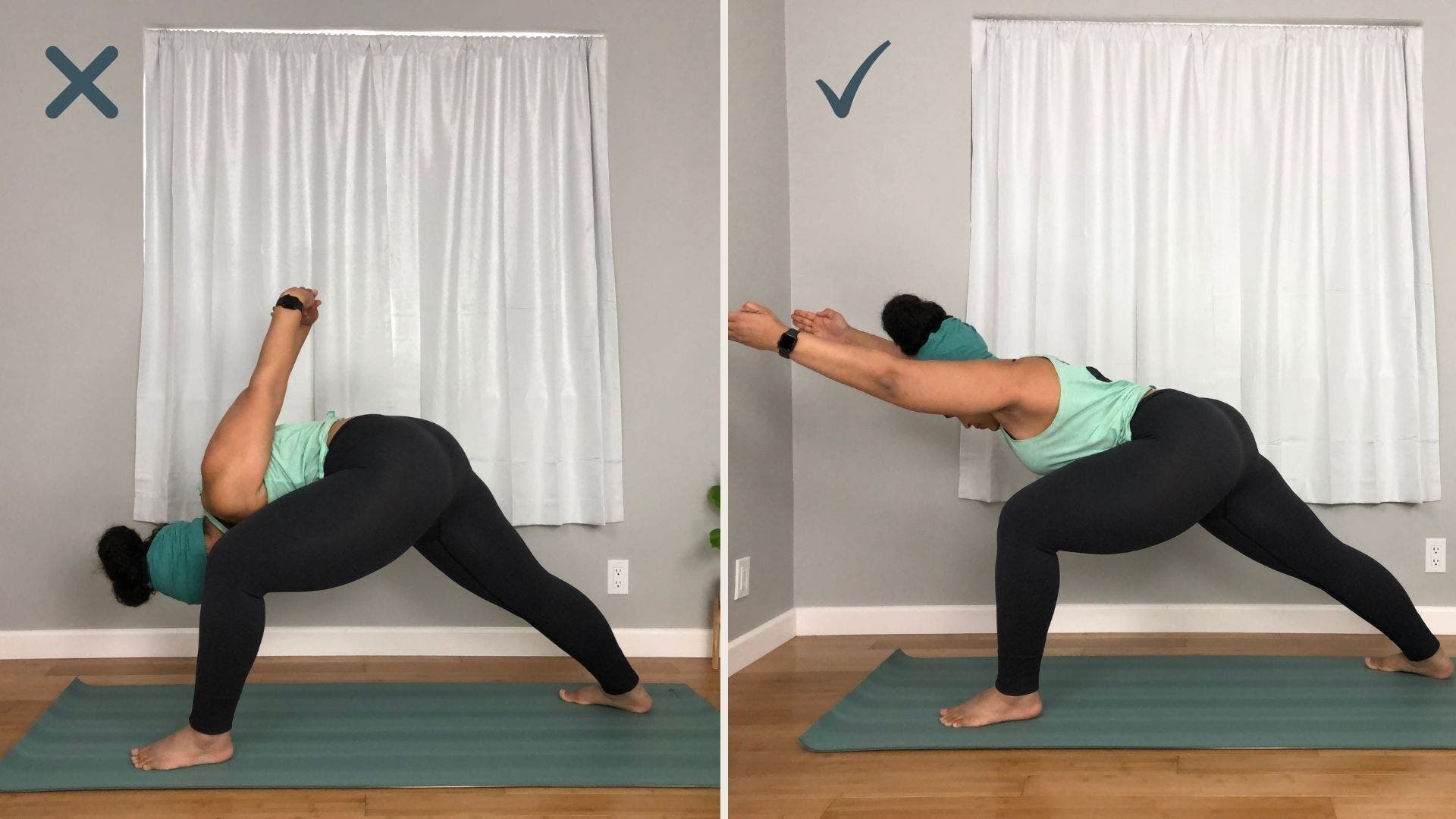 How to: After you have stepped your foot forward and set up for Warrior 1—feet hip-width, back foot angled forward the appropriate amount to work your pelvis toward square—bend your front knee. Lift your torso upright. When the rest of the class interlaces their hands behind their back, fold forward over your front leg. and reach your arms straight forward instead.
