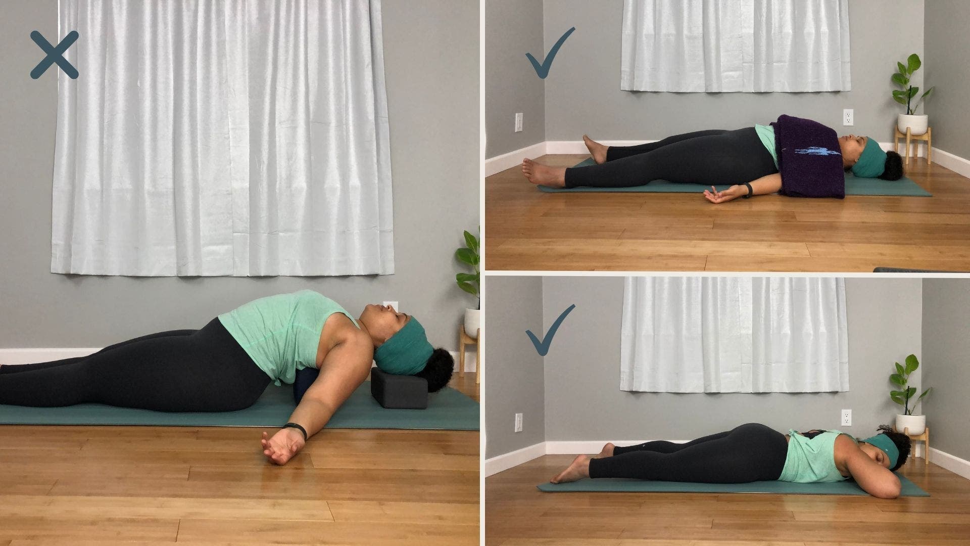 How to: Option 1: When the rest of the class grabs blocks to lie upon, you will grab a blanket and lie directly onto the floor. Take your blanket across your chest at shoulder height. It should feel weighty. If it’s too light, consider a second or even third blanket. If it feels safe, close your eyes or cover them with a towel or eye pillow.