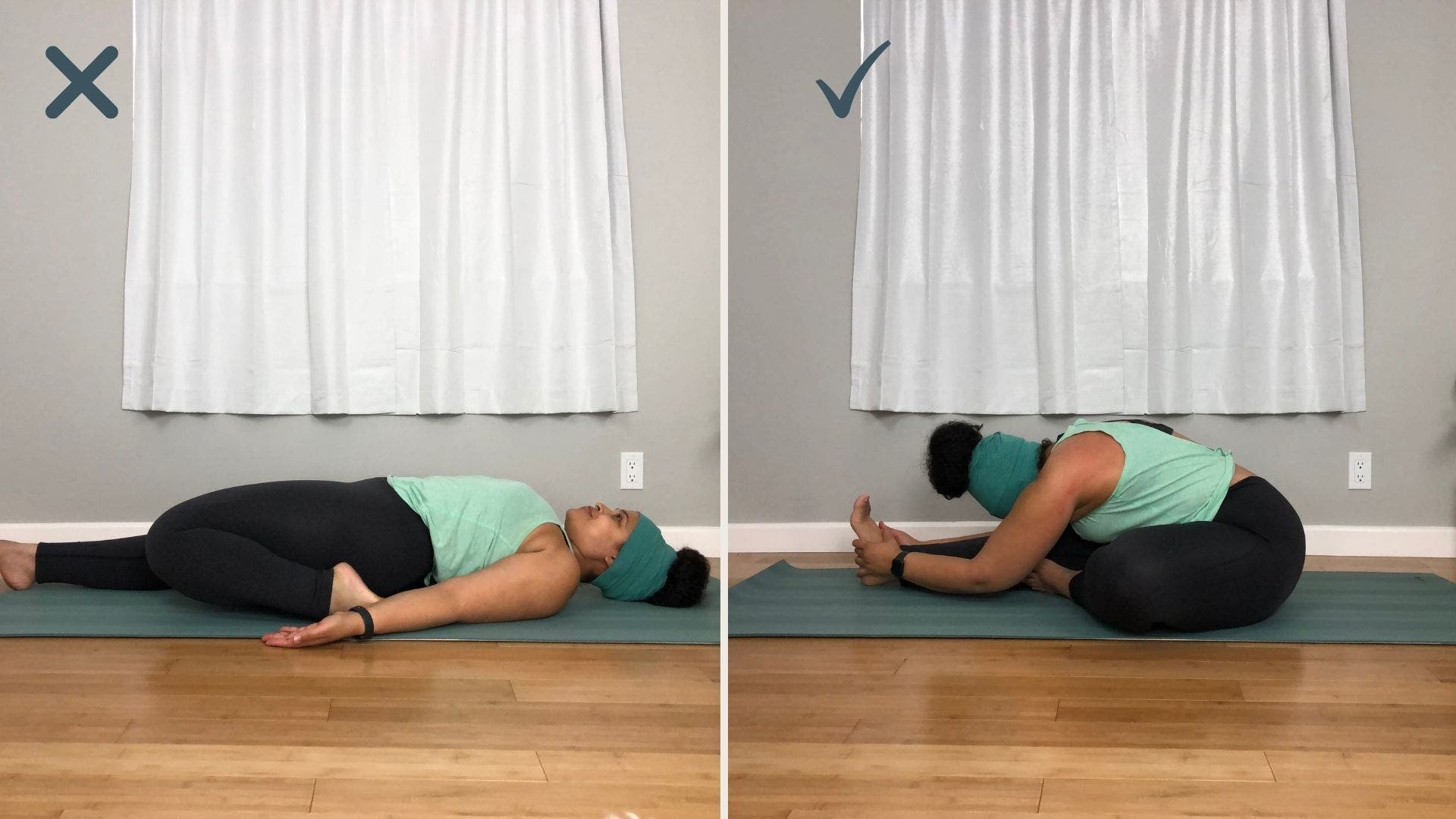 How to: Come to sit in Paschimottanasana (Seated Forward Bend) with both legs straight ahead. Rather than taking your right leg back into Supta Virasana (Reclining Hero Pose), you will bend your right knee and pull your right heel up toward your left groin. When the rest of the class remains upright or leans back, you will fold forward over your left leg. You may grab your left foot or simply rest your fingertips, palms or elbows on the floor, and fold.