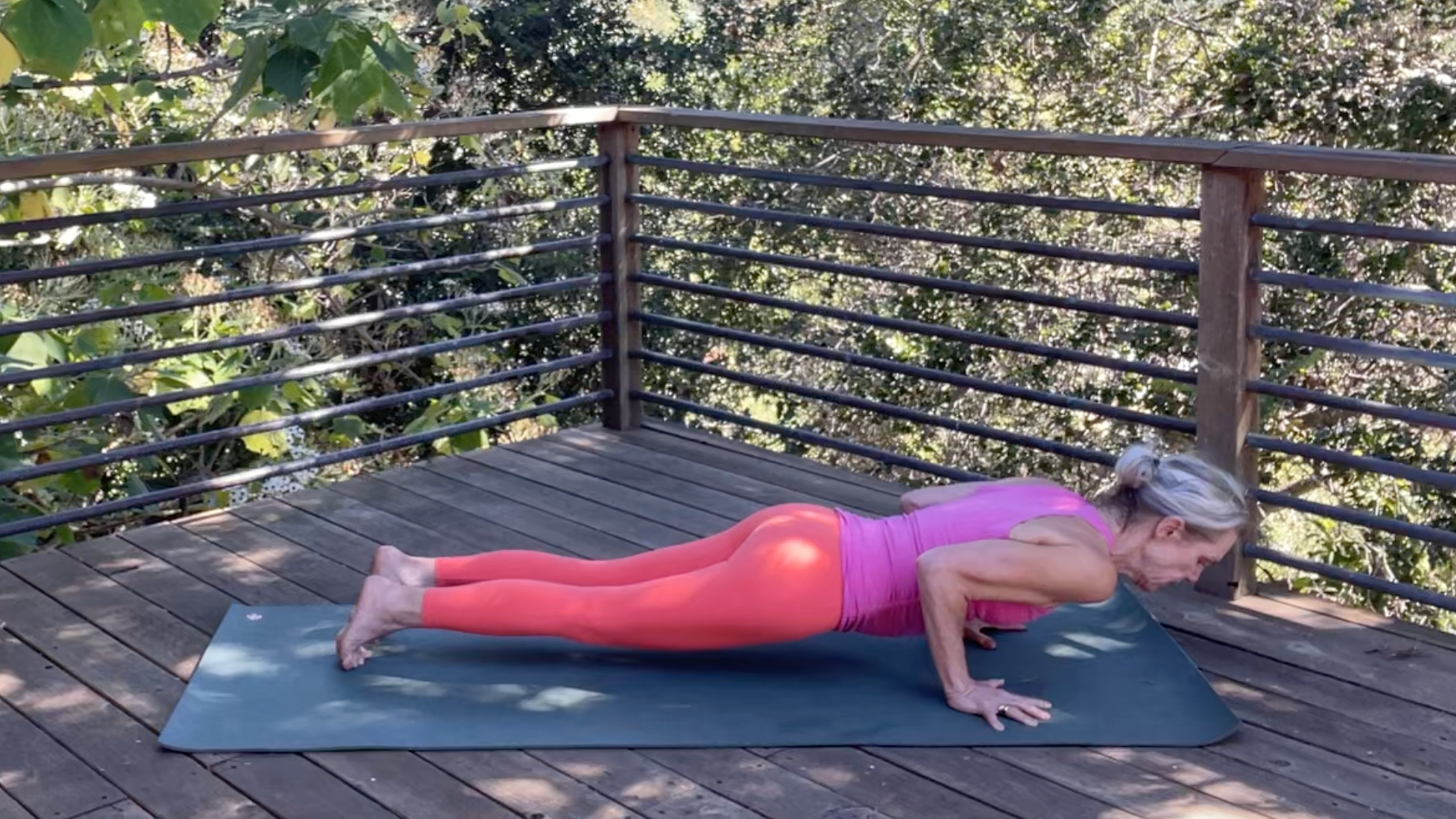 Stay in Plank Pose or lower your knees to the mat. If it’s accessible to you, take 5 Chaturanga push-ups with your knees up or down.
