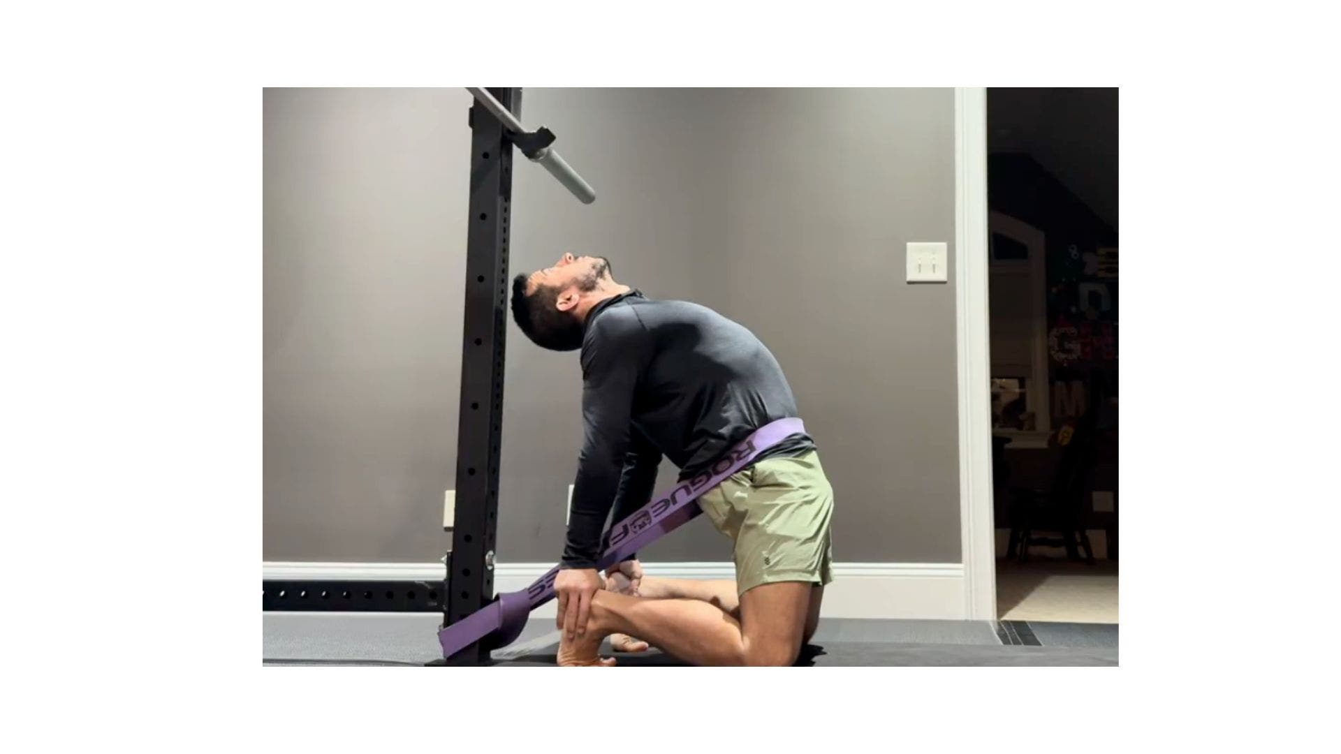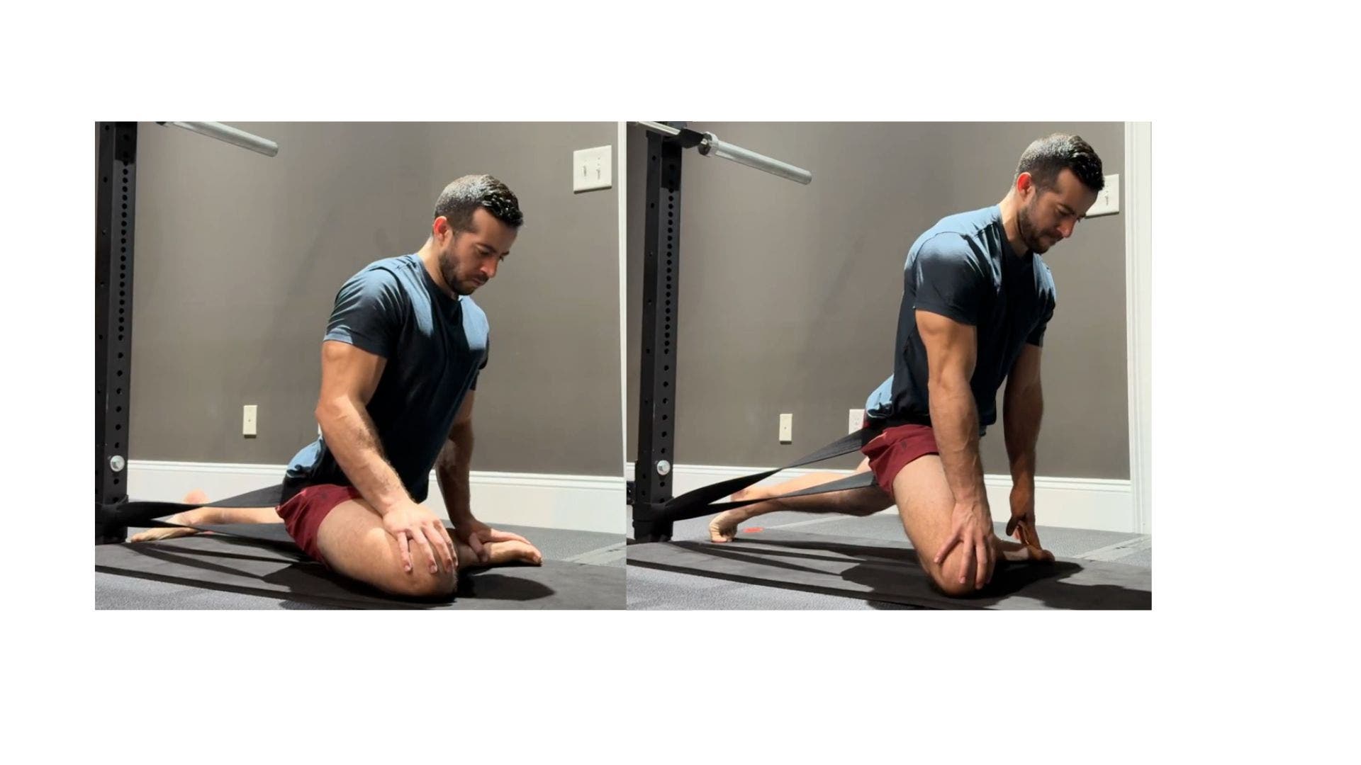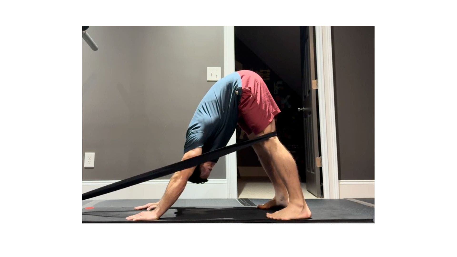 Using the band in Down Dog activates reciprocal inhibition, which engages muscles on one side of the body (quadriceps) and releases muscles on the opposite side (hamstrings). This unlocks new range of motion.