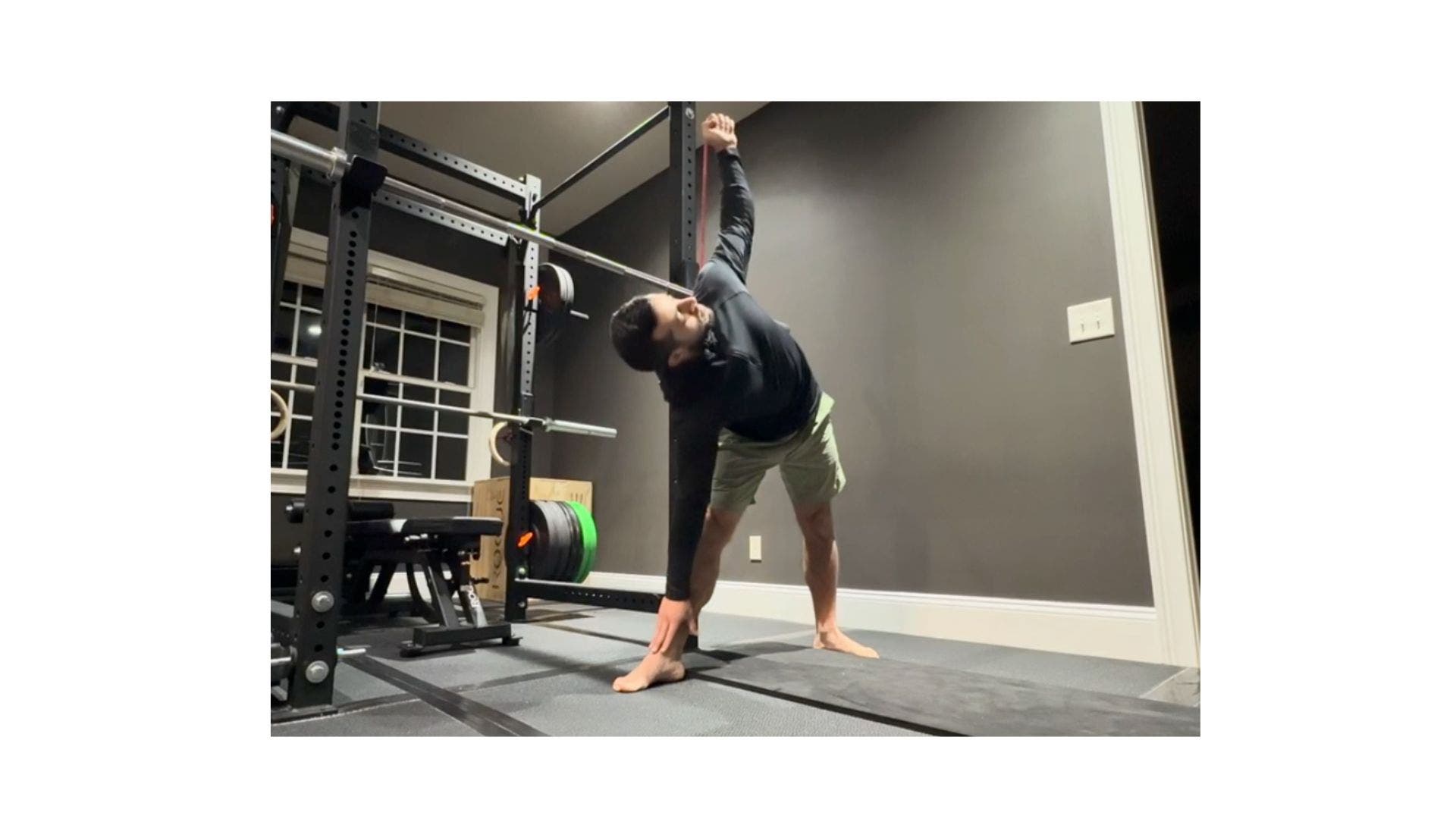 Place your free hand on that same side thigh just above your knee. Slide it toward your shin as you lean forward and straighten your banded arm as you reach toward the ceiling. Allow the band to rotate your torso open in a shape similar to Triangle Pose. Keep your banded wrist straight. Stay here for up to 30 seconds. For an added challenge, slide your bottom hand back up your leg to your thigh and down again. Then release and repeat on the other side.