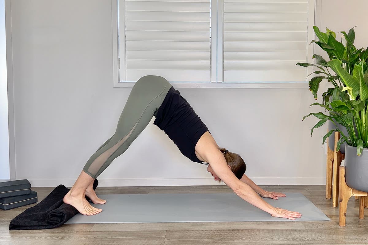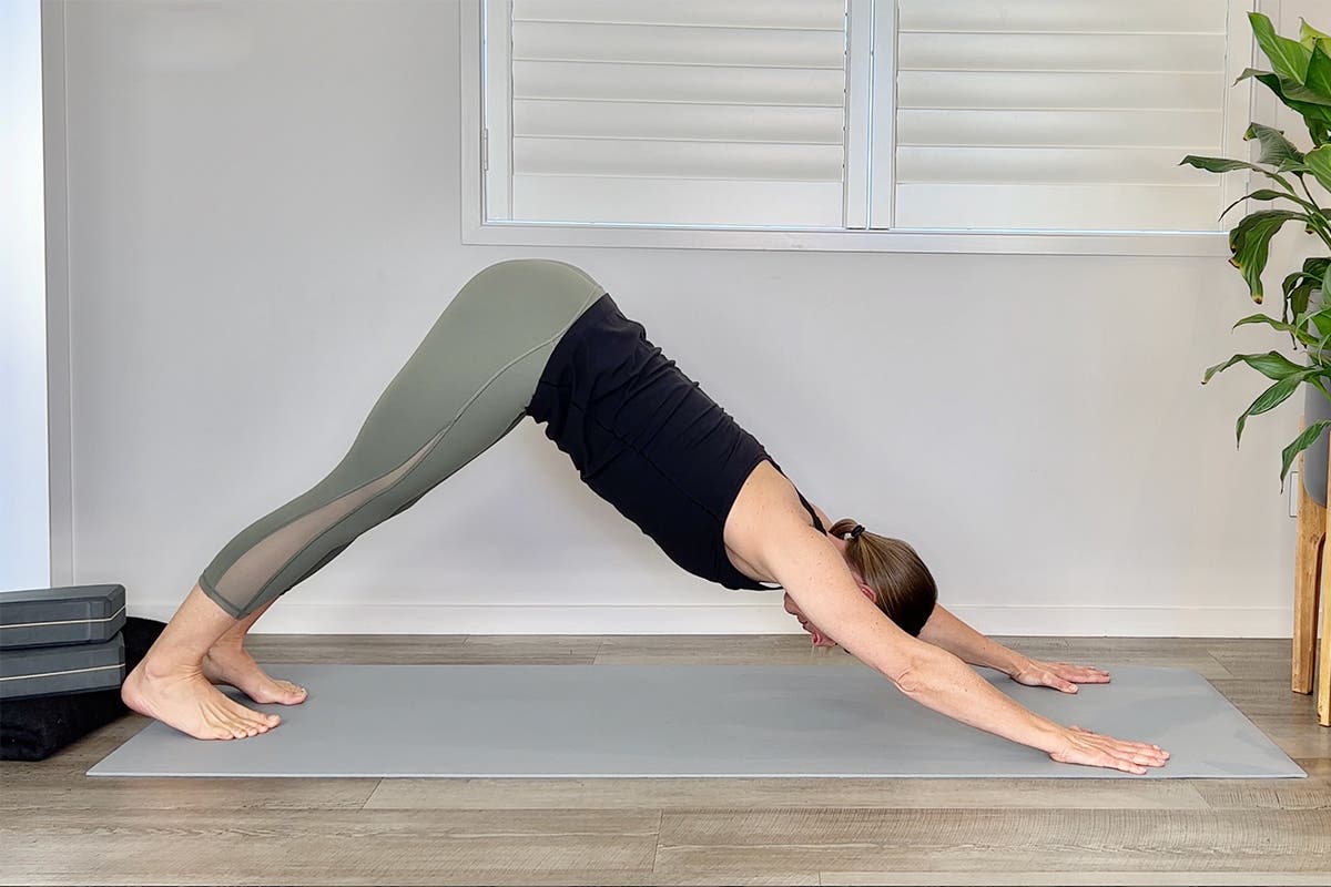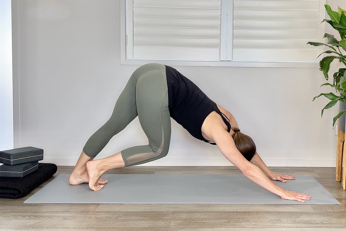 How to: From Down Dog, walk your feet mat-width apart or, if it feels more comfortable, take them past the edges of your mat.