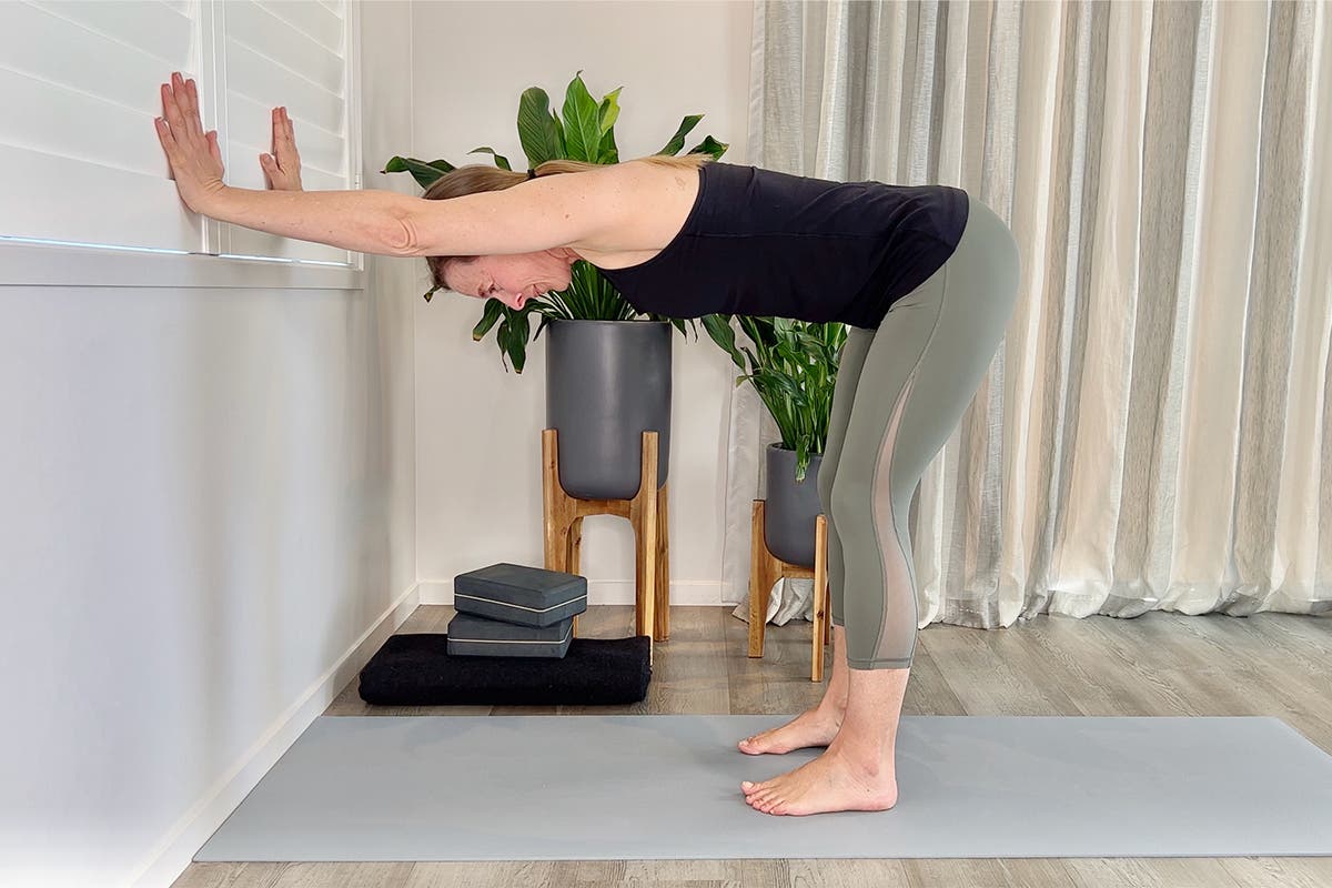 How to: Stand facing a wall. Place your hands on it at about shoulder height and width. Fold forward at your hips, walking your feet away from the wall and your hands down the wall until your arms and upper body are horizontal at hip height. Soften your knees and your neck, and let gravity help you release your chest through your upper arms toward the floor, similar to the sensation you feel in Puppy Pose.