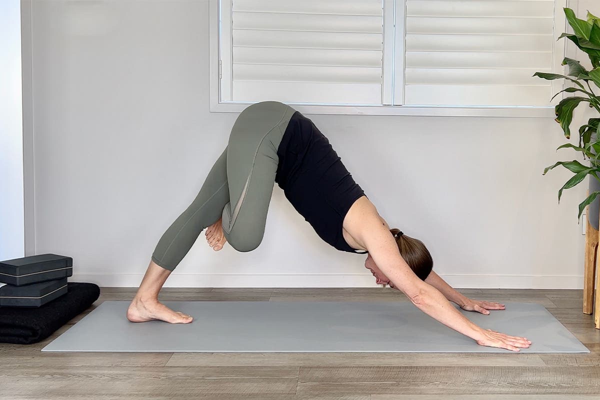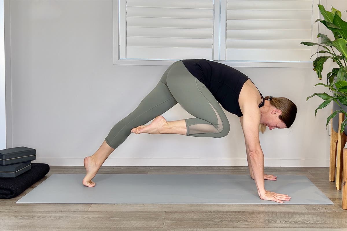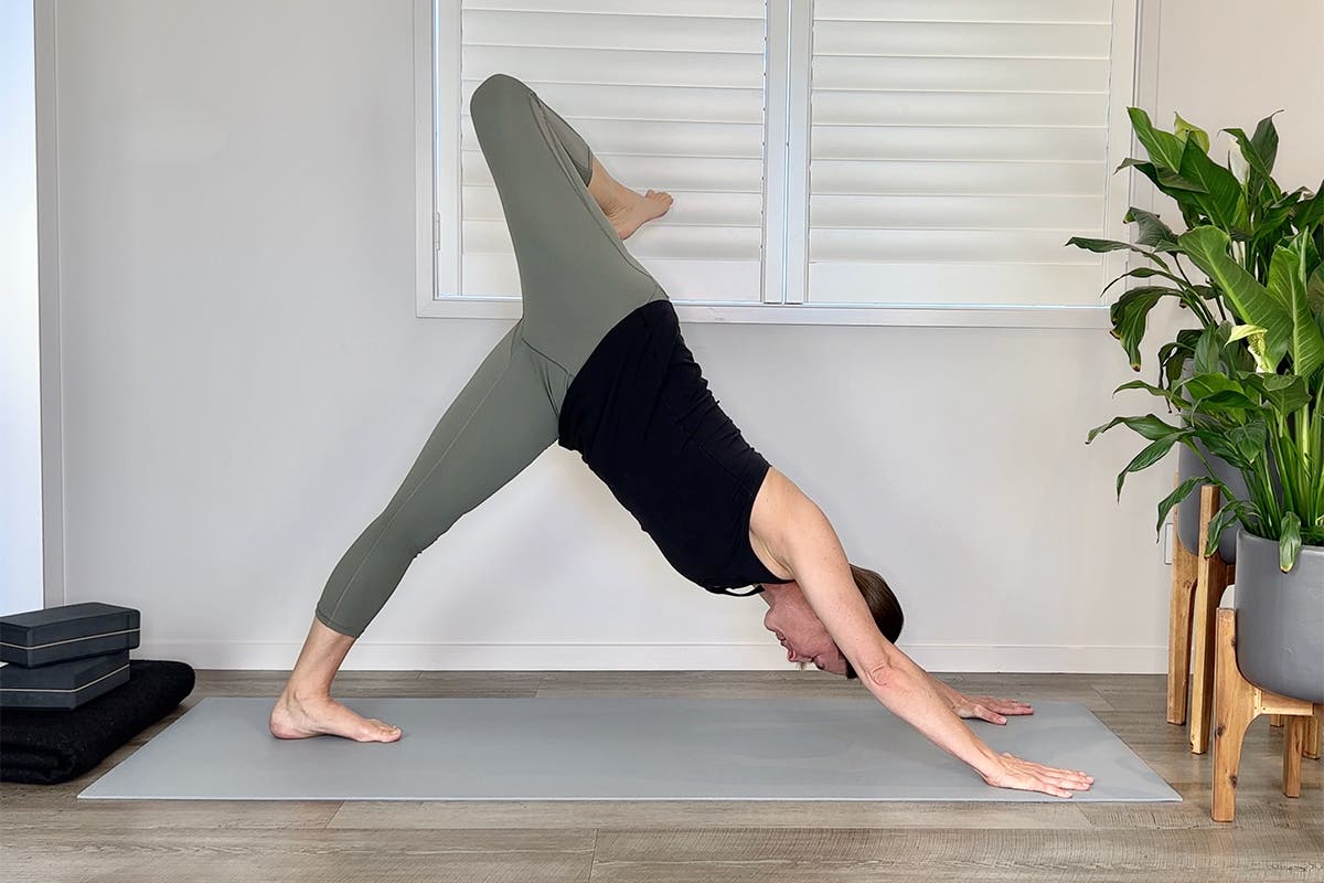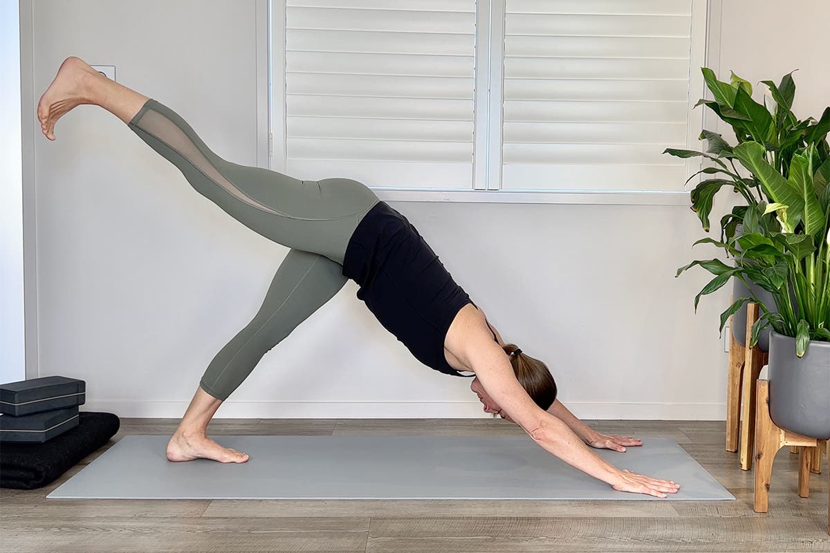 How to: From Down Dog, lift one leg and sweep it up and back toward the ceiling. Turn your hips in the direction of the raised leg to help lift it higher. You can keep your lifted leg straight and reach through your toes, or bend your knee and let your heel fall toward your sit bone.