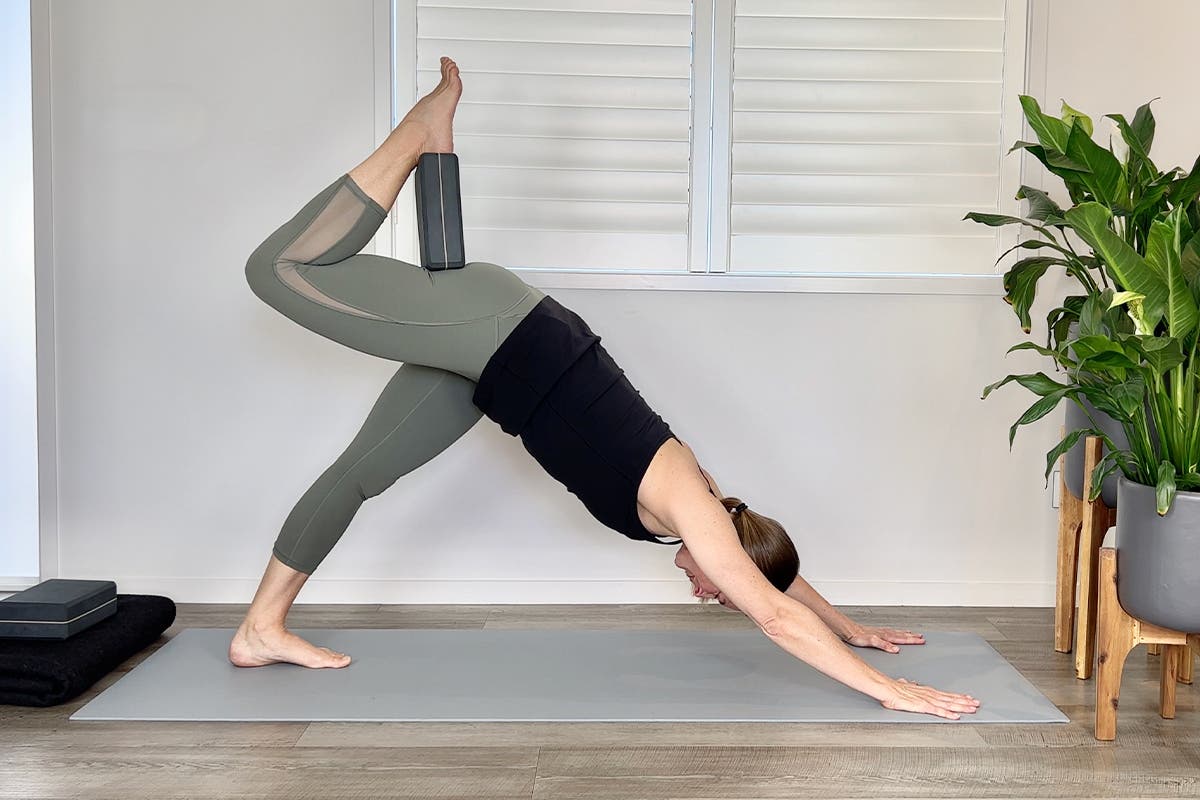 How to: Start on all fours to position the block between the back of one heel and the same-side sit bone. Contract the back of that leg to keep the block snug in place as you lift into a one-leg Down Dog on your other leg. Slowly lift your bent knee as high as you can while keeping your hips square to the mat. Feel the muscles around your sit bone and down the back of your bent leg engage. Stay here for a couple of slow breaths before returning to all fours. Swap sides.
