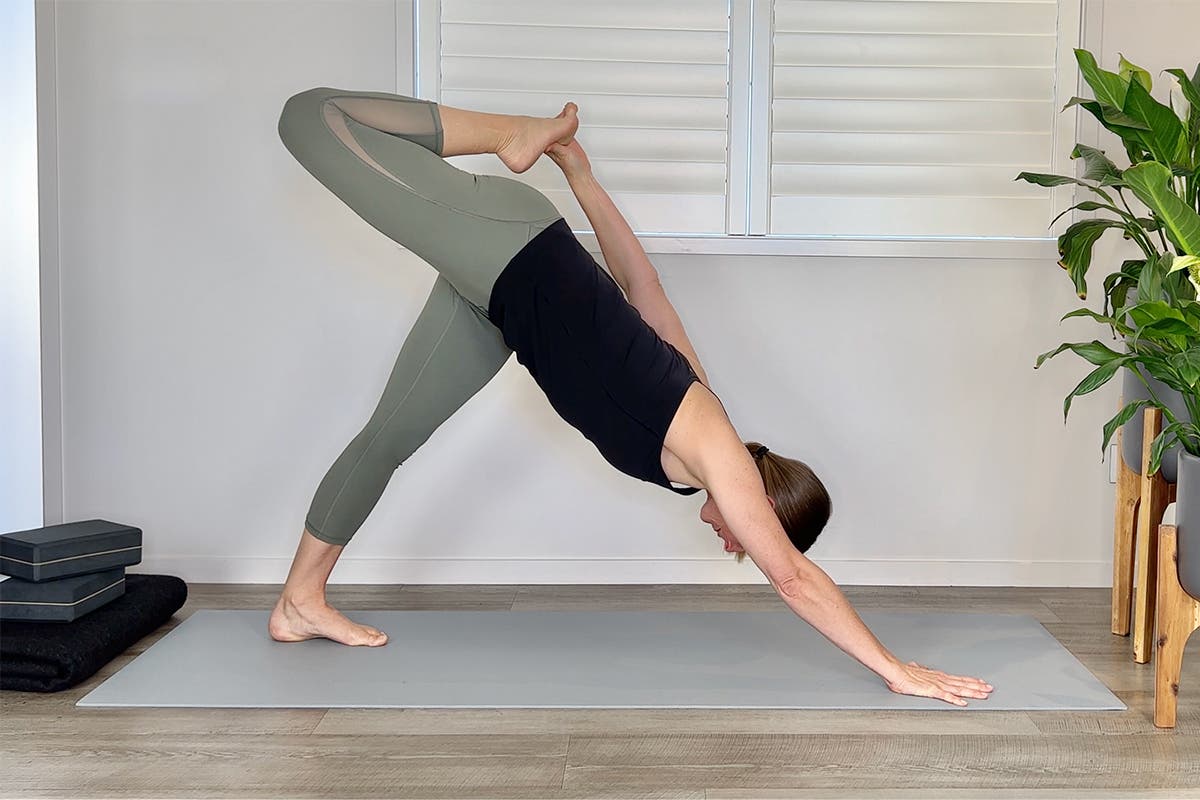How to: From Down Dog, lift one leg behind you as you keep your hips steady and square to the mat. Slowly float your opposite hand off the mat and reach it alongside your body toward the back of the mat. Keep your gaze steady on your grounded foot as you bend your lifted knee and bring that foot and your lifted hand to touch behind your sacrum. Once you grasp your foot, pause to soften the sides of your neck and your breathing before releasing the bind and coming back to Down Dog. Repeat on your second side.