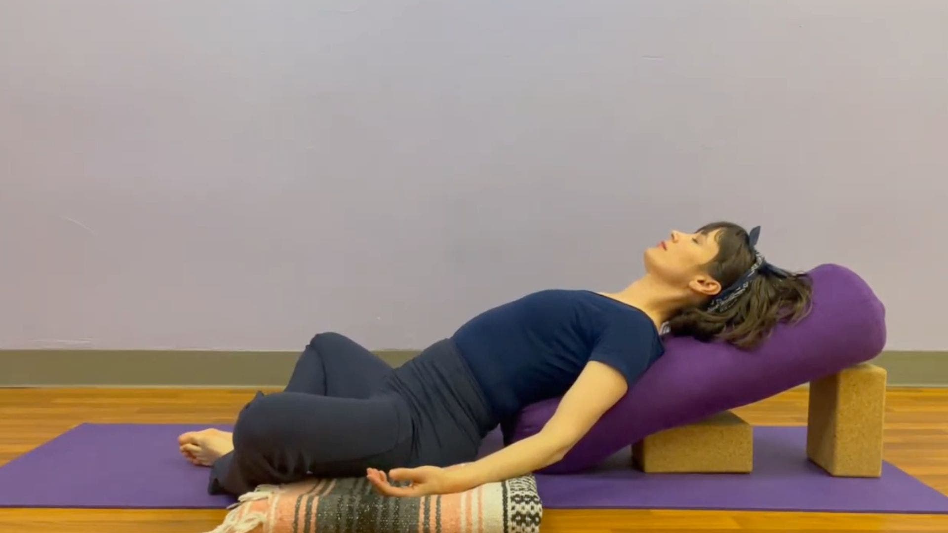 Typically practiced lying flat on your back with your arms out to the sides, Savasana doesn’t require props. Practice this way if it’s comfortable. If not, place a bolster, pillow, or rolled blanket underneath your knees. You might be surprised how much more you can relax with just a little bit of support.