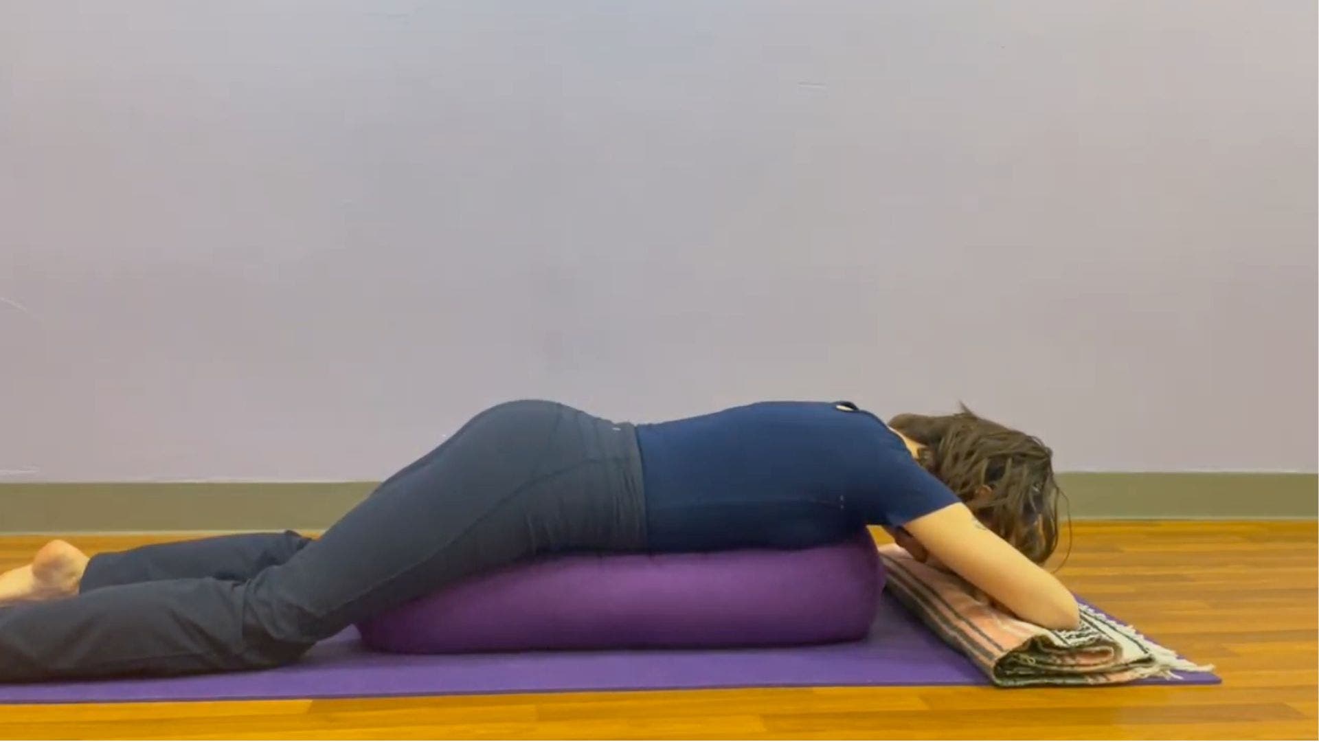 Place the bolster lengthwise on the mat in front of you. Lower yourself, belly down, onto the bolster or stack of pillows. Rest your legs straight behind you, hip-distance apart or wider, and stack your forearms on a folded blanket or towel at the end of the bolster. Rest your forehead on your hands. Some people like to place another blanket underneath their forearms, knees, or rolled under their ankles. Let your weight rest against the bolster.