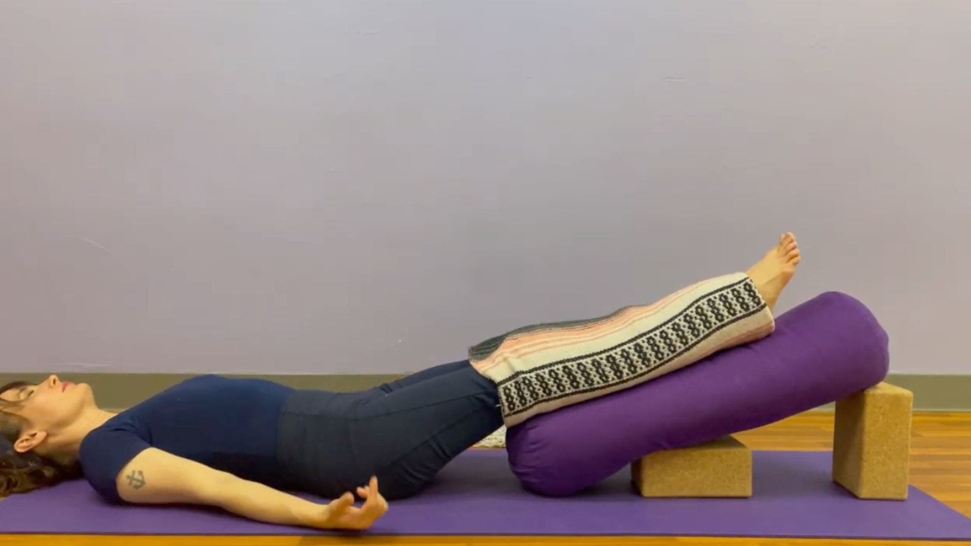 Relaxation technique: Practice mindfulness by noticing your surroundings. What do you hear around you? What do you taste and smell? What sensations do you feel on your skin? Perhaps the touch of air, your clothes, or the gentle pressure of the bolster beneath you. Then notice what’s going on inside your body and mind. Acknowledge any thoughts that are taking you out of the present moment, and get curious as to how it would feel to let them go.