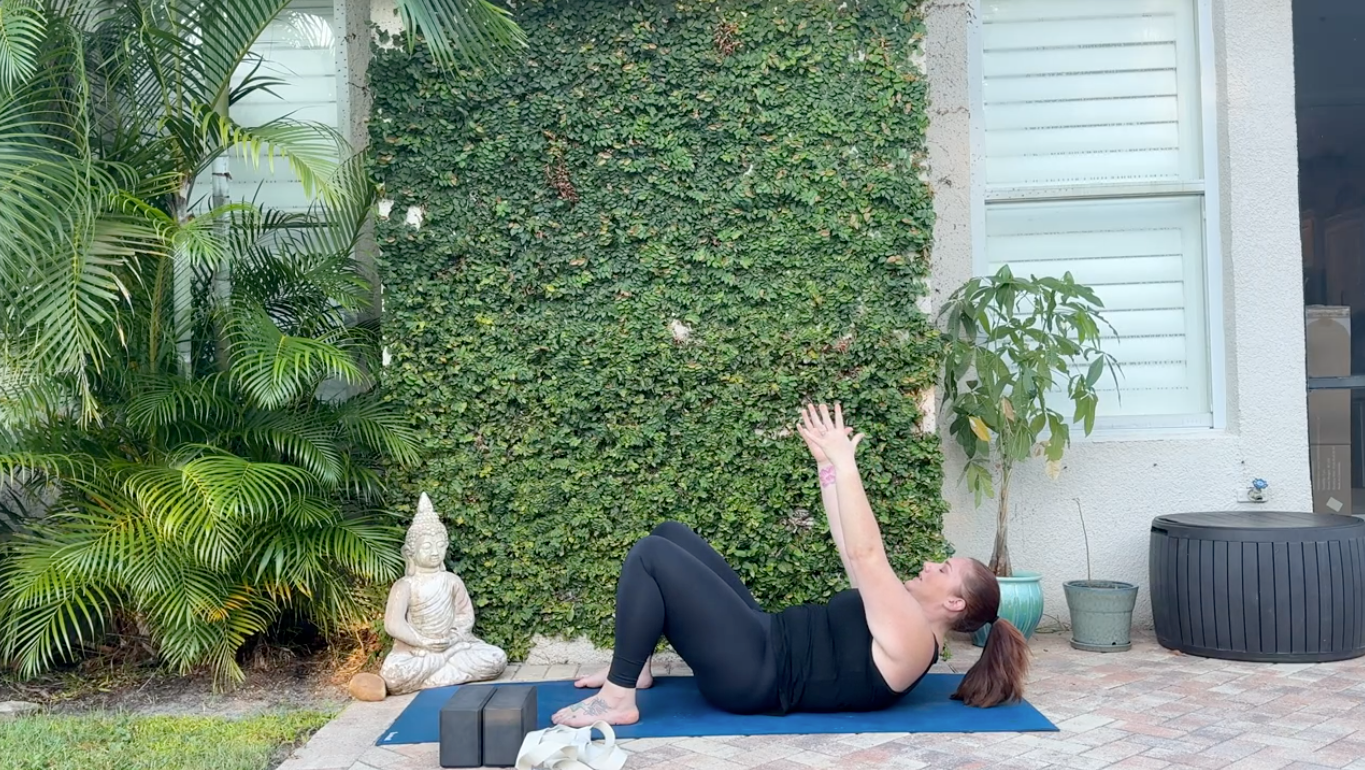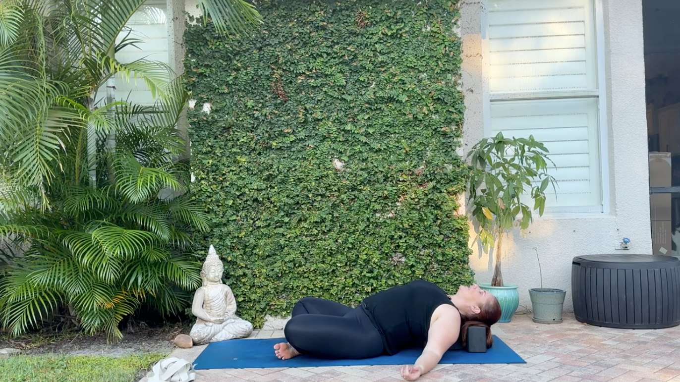 Lie down so the block is between your shoulder blades. Bend your knees with your feet flat on the mat. Allow your head to release back or place the second block underneath your head for support. Straighten your arms to the sides in a T shape. Stay here for 10-15 breaths.