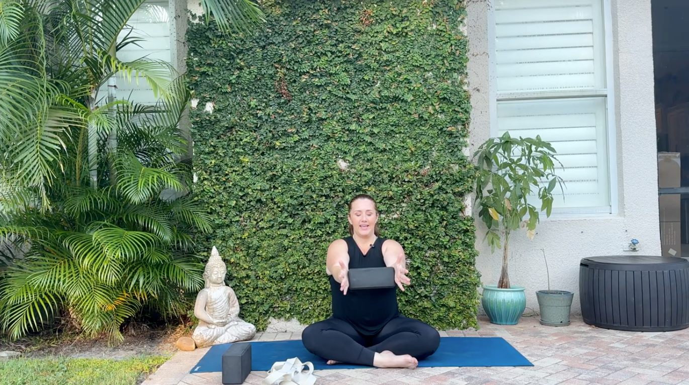 Sit tall in a cross-legged position or oin a chair. Squeeze a block on its widest setting between both hands, then straighten your arms in front of your chest.