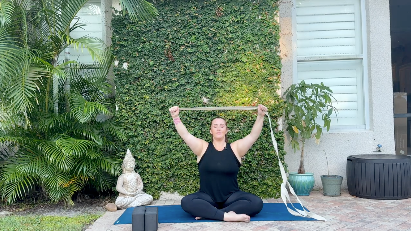 Using a strap to create resistance helps activate your shoulders the same way you would in Mountain Pose or Warrior 1, or even if you’re simply working on better posture.