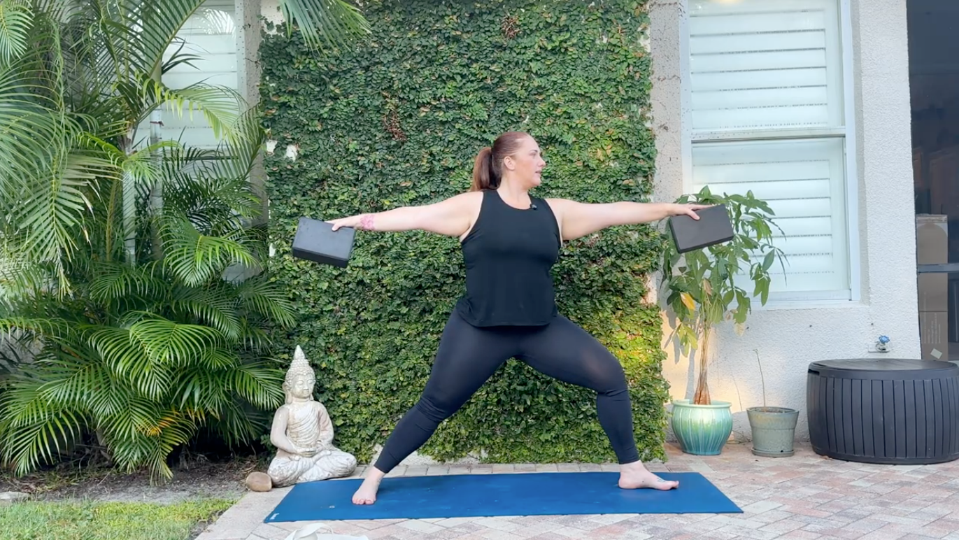 Simply holding a block in each hand while practicing Warrior 2 can help build strength in your arms and shoulders. Transitioning into Extended Side Angle with the blocks activates the latissimus dorsi (the widest back muscle), which translates to stronger shoulders and better posture.