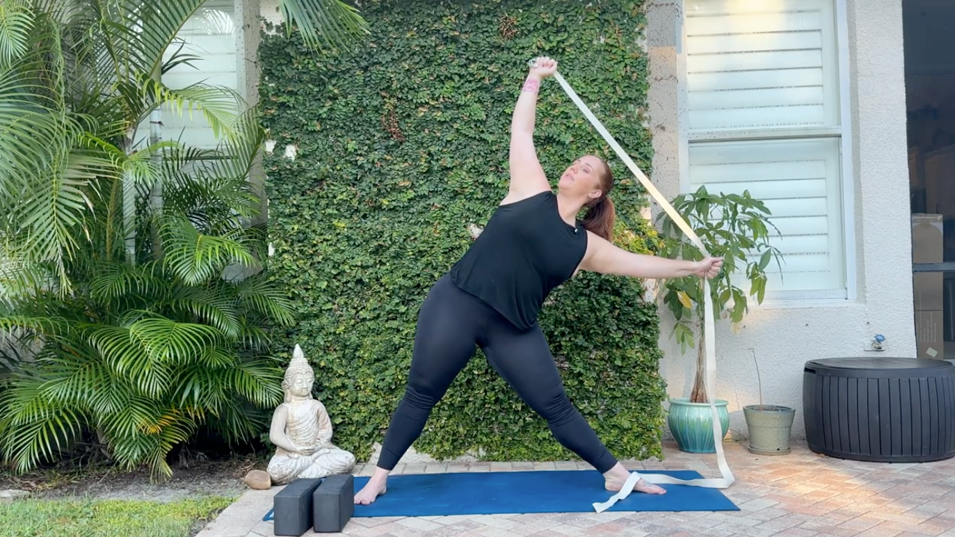 Pulling against the strap not only activates your shoulders and upper back muscles, but it can help you feel steadier in Triangle Pose when you practice without it.