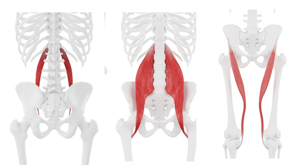 Three of several hip flexor muscles, including the psoas minor (left), psoas major (center), and sartorius (right). (Illustration: Sebastian Kaulitzki Science Photo Library | Getty)
