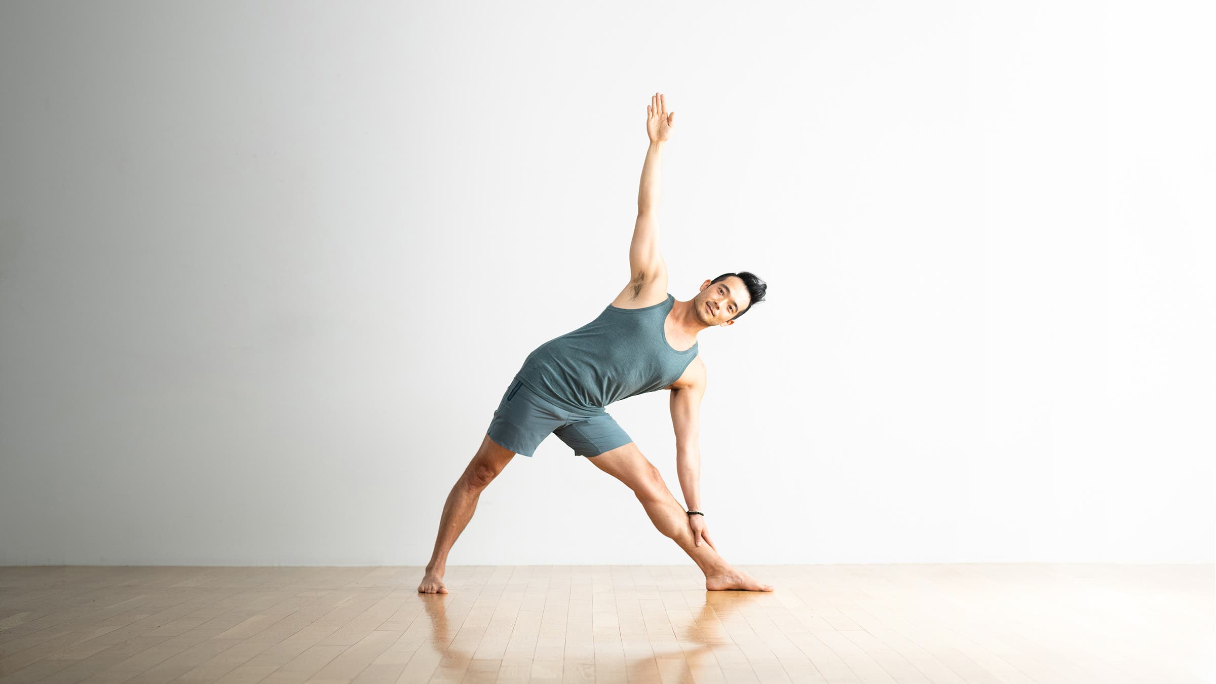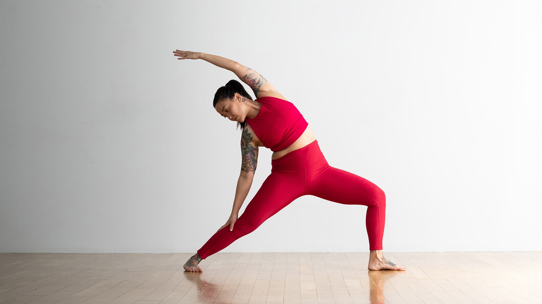 Many poses traditionally ask you to turn your head and lift your gaze to your raised hand. However, if that much cervical rotation is uncomfortable, you can keep your chin in line with your chest and your gaze straight ahead. This allows you to lengthen equally through all sides of your neck.