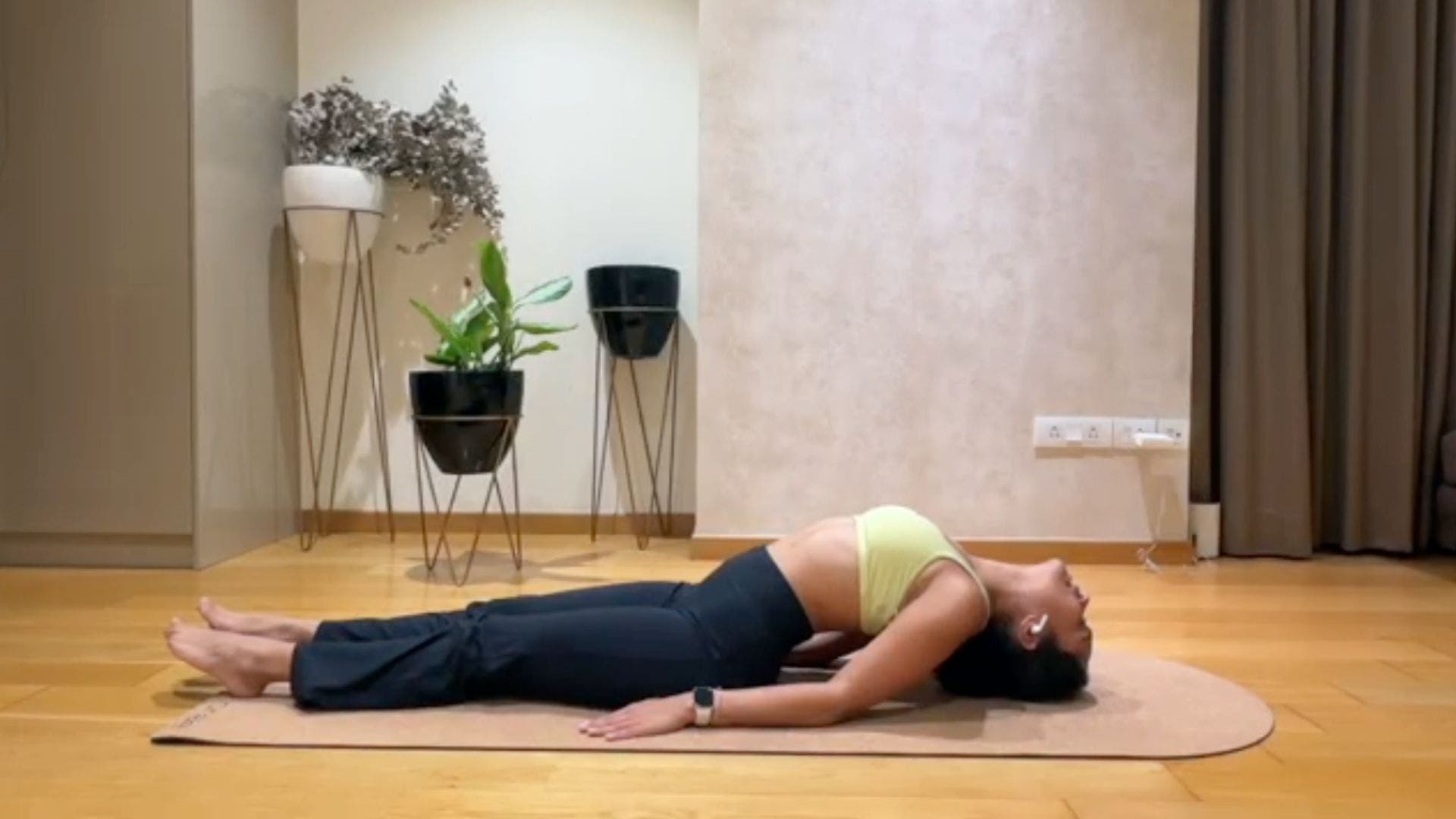 How to: Lie on your back, prop yourself onto your forearms, and draw your elbows toward your ribcage. Lift your chest and gently release your head back, resting the crown of your head on the mat in Fish Pose. Stay here for 5 breaths, then release.