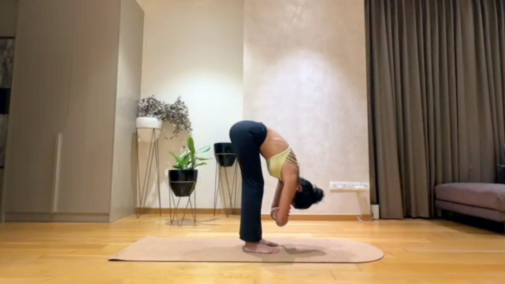 How to: Stand with your feet hip-width apart. Interlace your fingers behind your back, straighten your arms as much as possible, and hinge forward from your hips. Let your hands reach toward the ceiling as you release your head toward the mat. Stay here for 5-7 breaths.