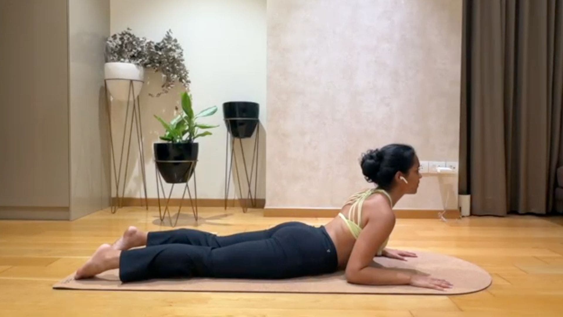 How to: Lie on your belly with your elbows bent and your palms flat on the mat underneath your shoulders. As you inhale, lift your chest a few inches off the mat, drawing your elbows toward your ribs. Lower your shoulder blades away from your ears in Baby Cobra Pose. Stay here for 5-7 breaths, then release.