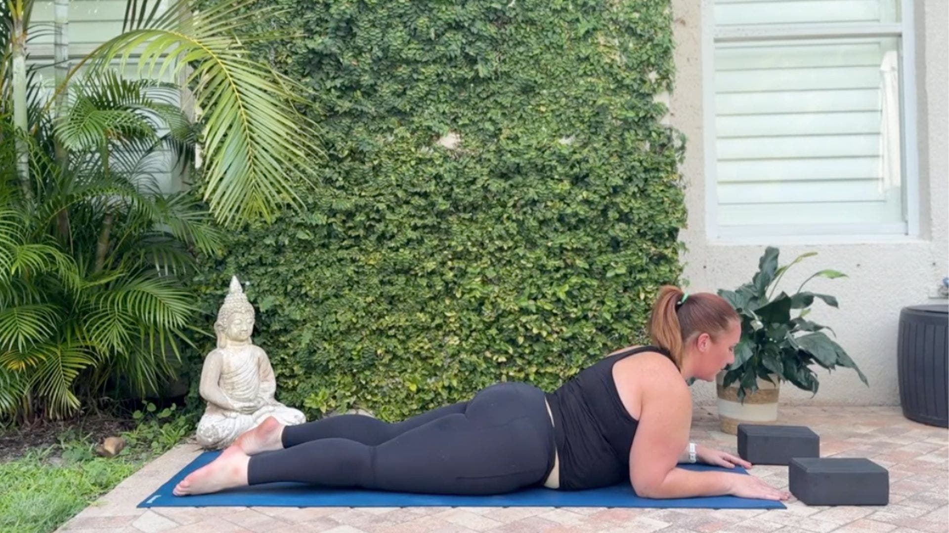 Come into Tabletop. Press your hands or forearms into the blocks, lift your chin, and arch your back in Cat Pose.
