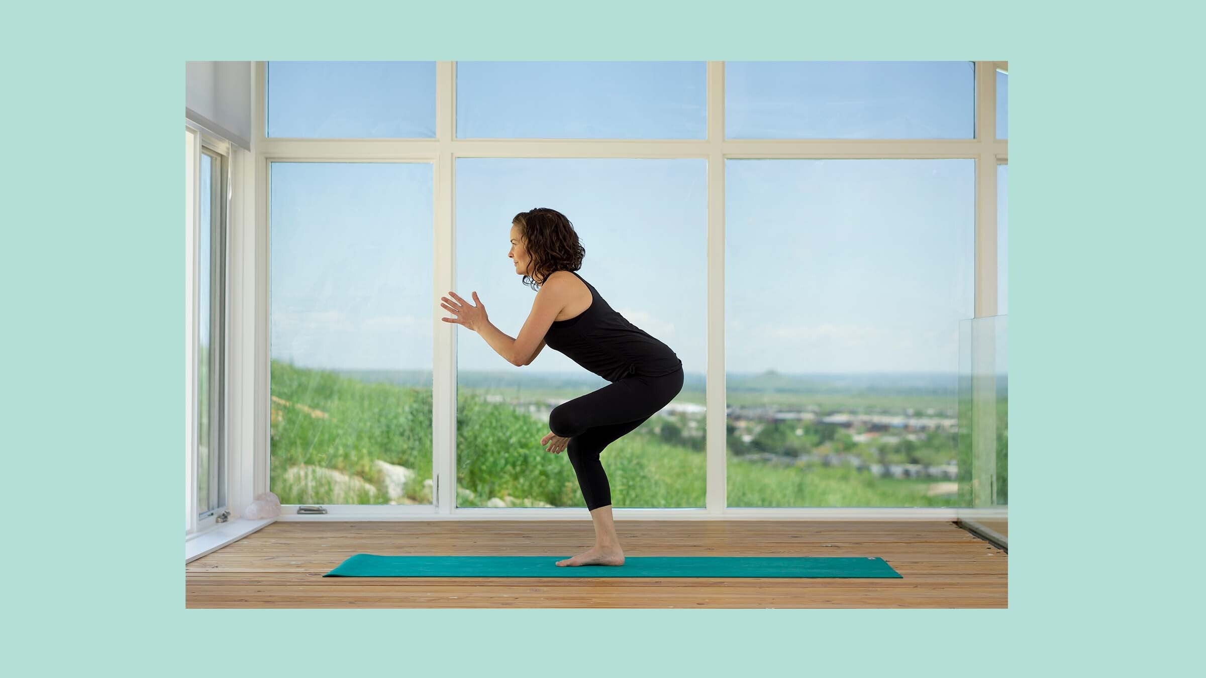 Stand in Mountain Pose and bring your palms together in the center of your chest in prayer position. Bend both knees and slowly lift your right foot off the mat. Pause until you find your balance. Cross your right ankle over your left knee. Engage your legs, flex your right foot by drawing your toes toward your right side, and hinge at your hips. Start to bring your hips back and lean your chest forward toward your thighs until you feel the stretch on your outer hip and glutes. Come out the same way you came into the pose. Repeat on the second side.