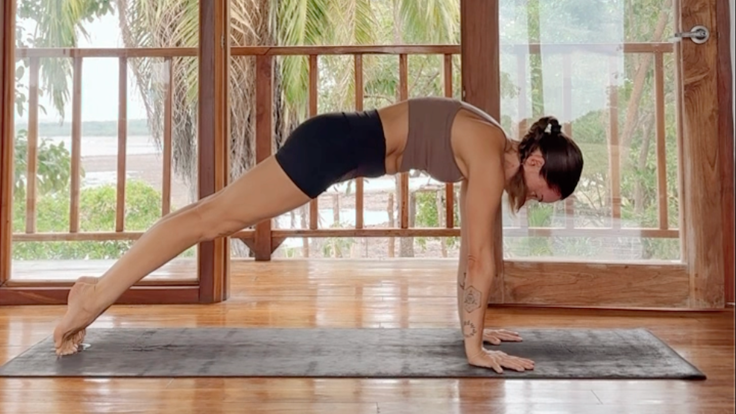Inhale back to Three-Legged Dog. With an exhalation, draw your right knee to your left shoulder, crossing your right knee beneath your body and keeping it lifted as high as possible. At the same time,draw your tailbone underneath you to engage your belly and obliques are active.