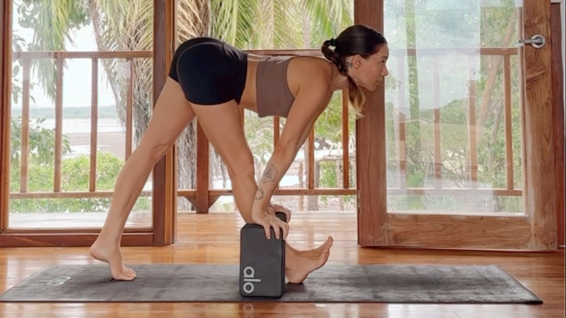 With an exhalation, move into Half Splits. Lift by curling the pelvis underneath you to compress and lift your right heel off the mat. Press deeply into the blocks to spread your shoulder blades.