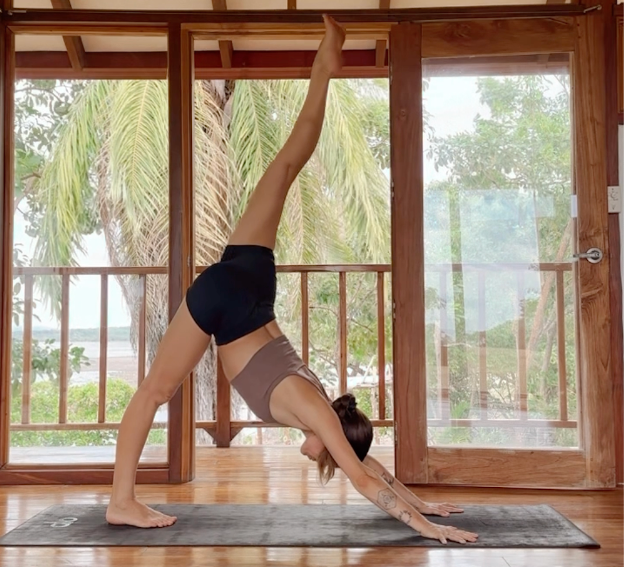 Inhale back to Three-Legged Dog. With an exhalation, draw your right knee to your right shoulder.