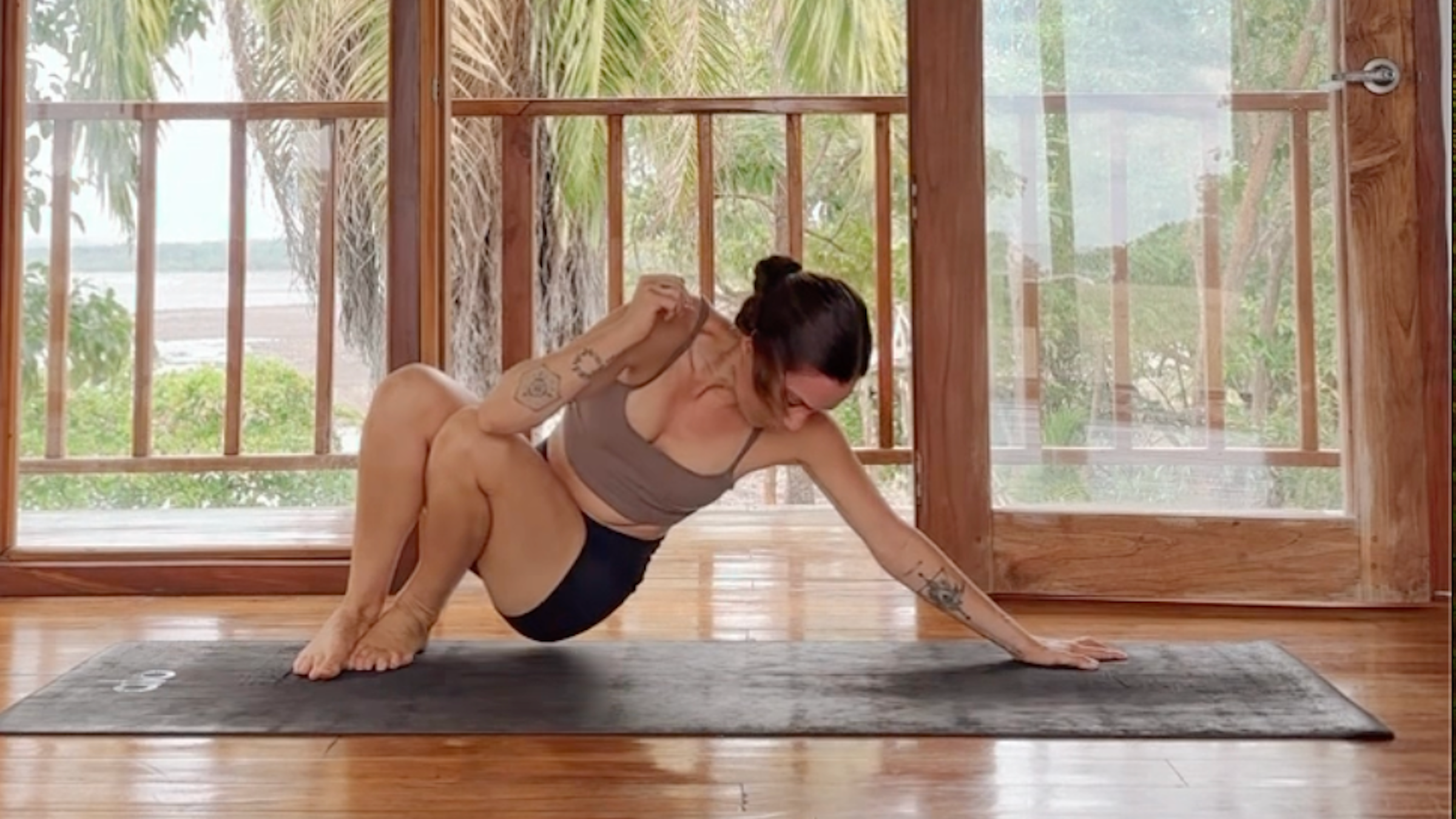 As you continue to breathe, work on drawing your outer right hip toward the back wall as you nudge the top of your left hip forward. Work on rotating the right side of your ribcage up and the left ribcage beneath you. Ensure that the twist is coming from your belly and not your upper back. Switch sides.