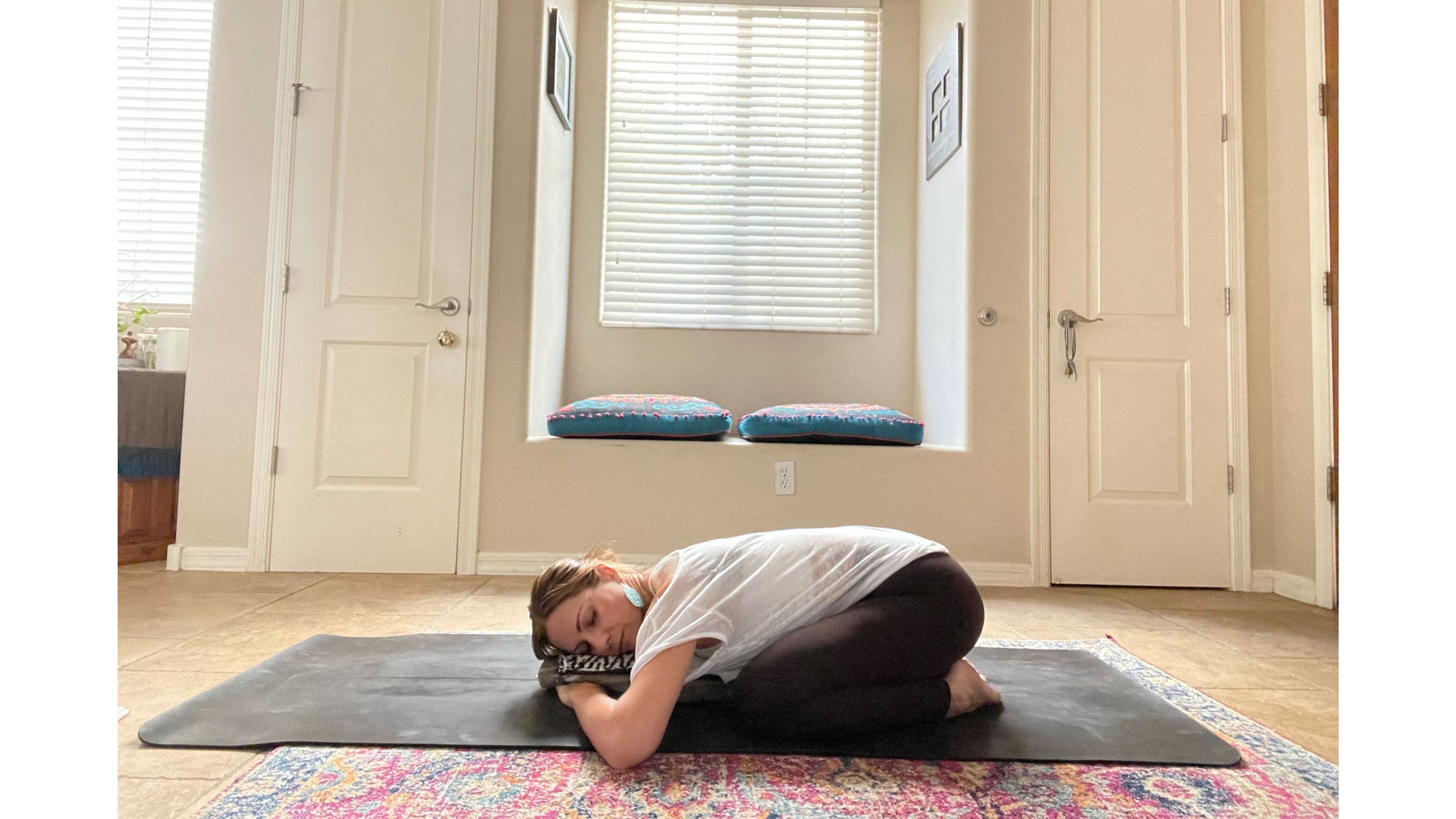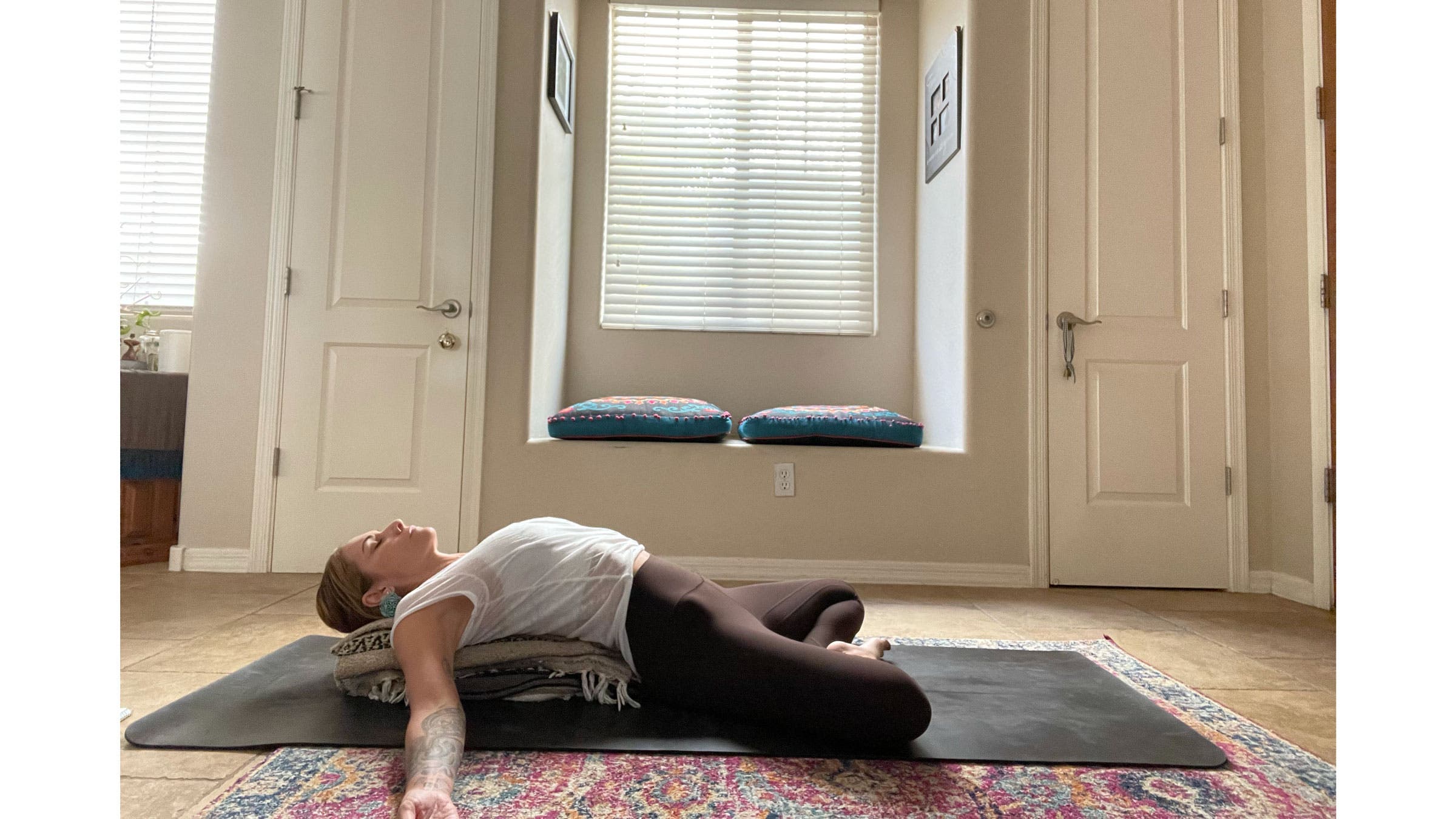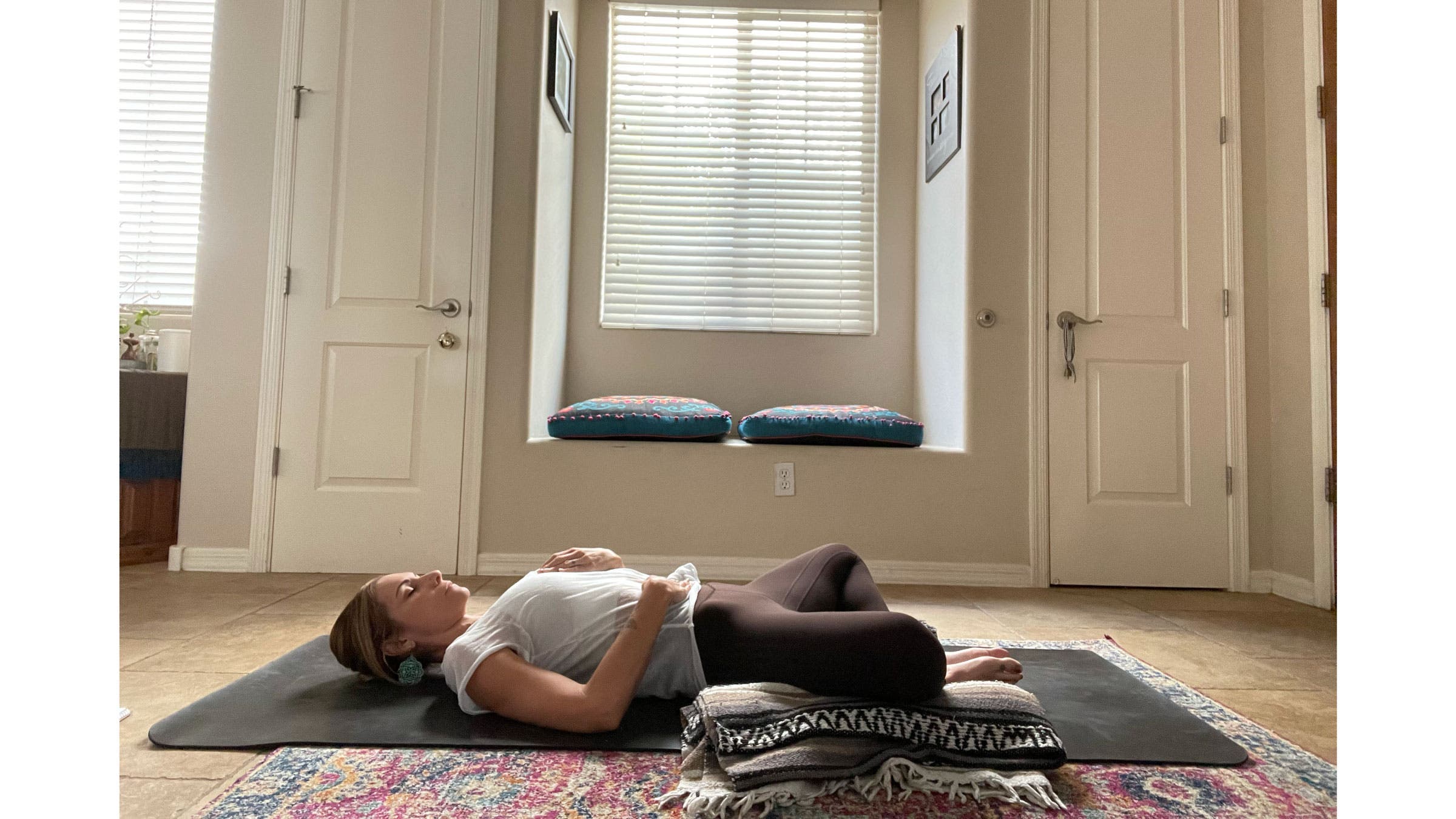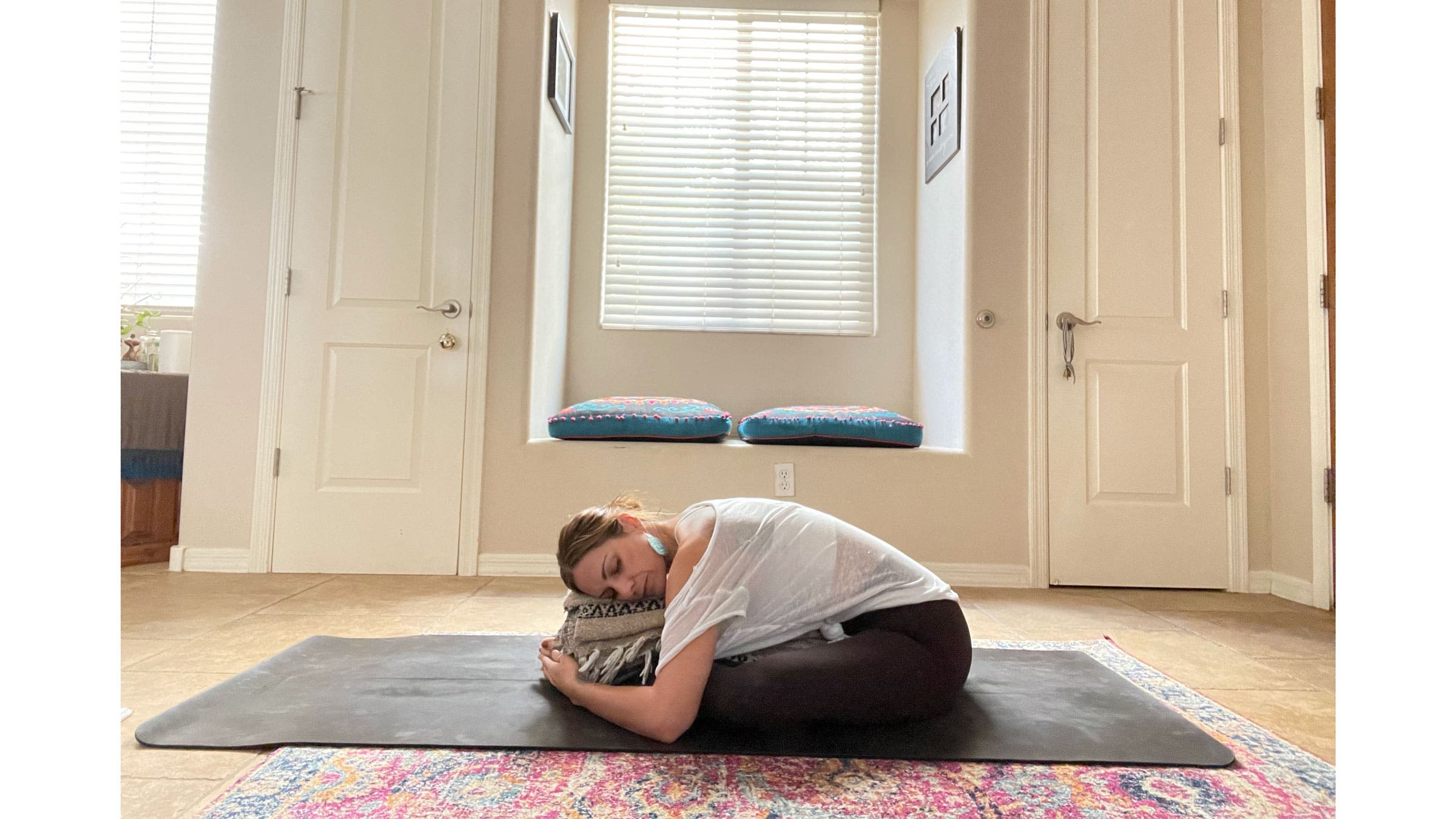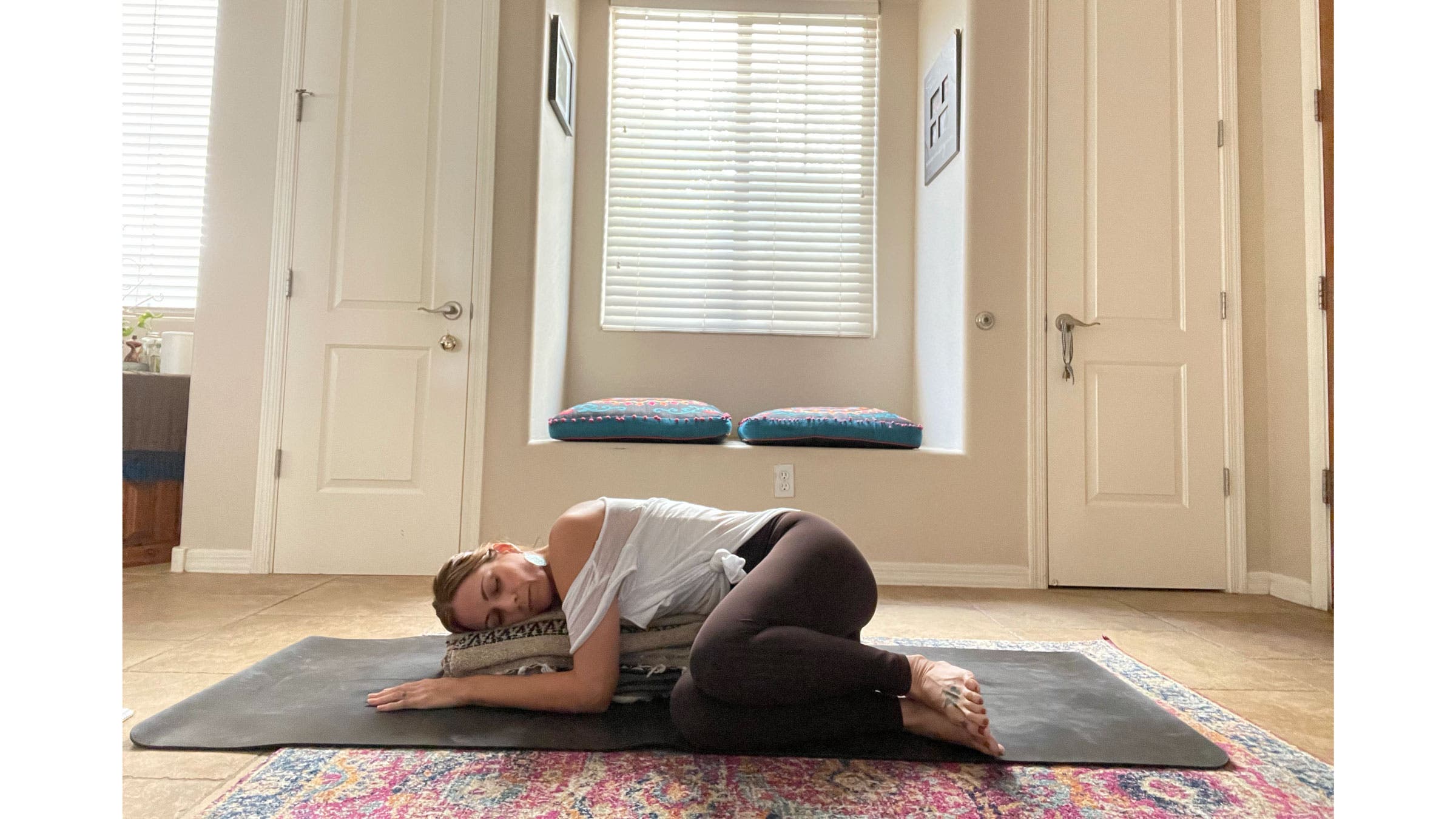From lying on your side, slowly bring yourself up to seated. Fold the blankets into narrow rectangles so they can easily stack one on top of the other, as you did for Child’s Pose. Bring the blankets lengthwise in front of you along the center of the mat. Come into a Supported Twist by bringing your right hip up against the edge of the blankets and coming to a seated position there. Bend both knees and stack them, one atop another. Place a hand on each side of the blankets and gently twist to face your blankets. Slowly walk your hands forward and place your chest on the blankets. You can face your head towards your knees or turn your head in the opposite direction. Bring an ever-so-slight tuck to your chin. Stay here for at least 2–3 minutes. Slowly release and repeat on the other side.