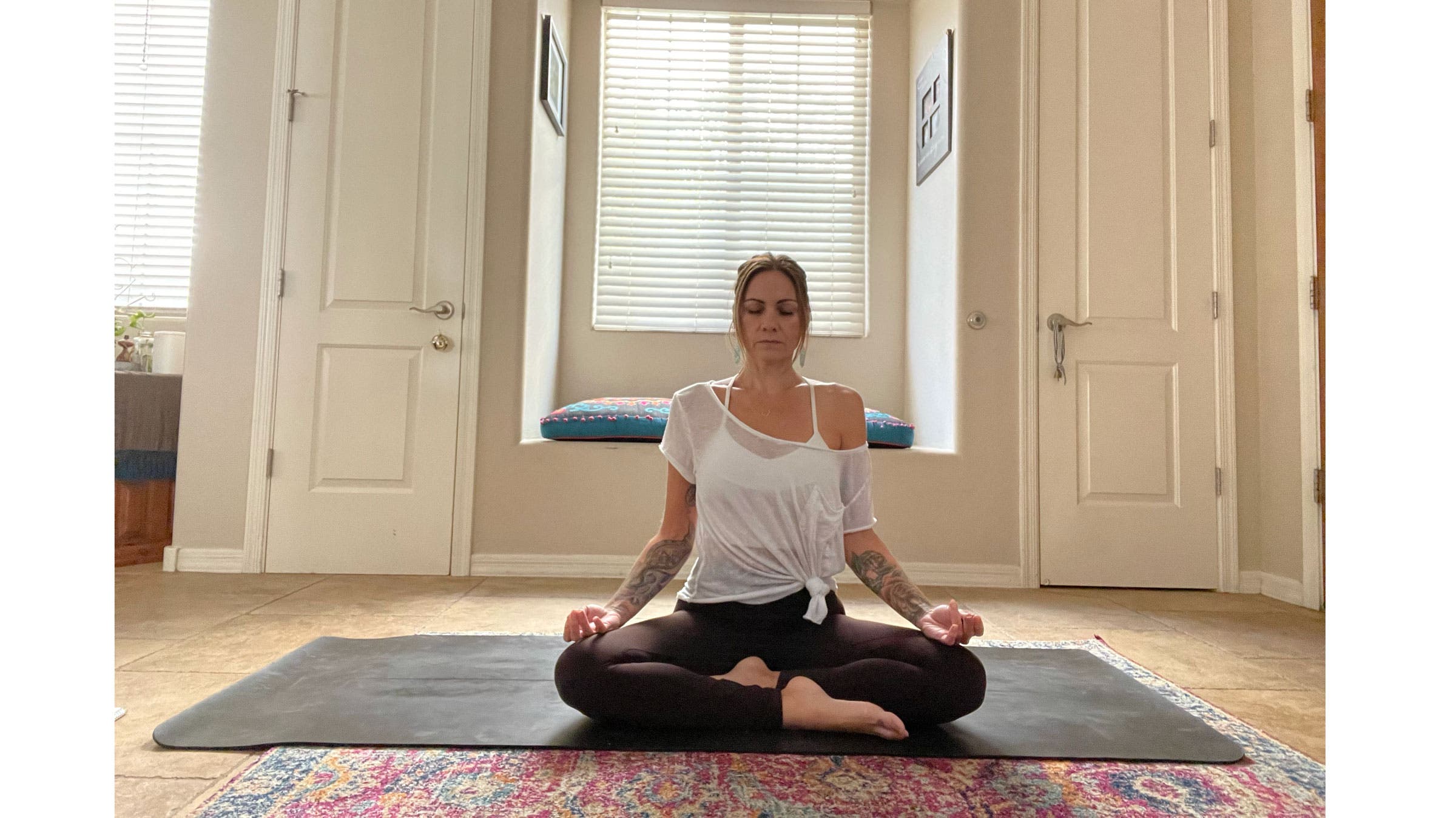 Start your practice seated in a cross-legged position. Take a moment and make any movement in your body that is needed to free up your shoulders, ankles, hips, and neck. Maybe move and shake your wrists.