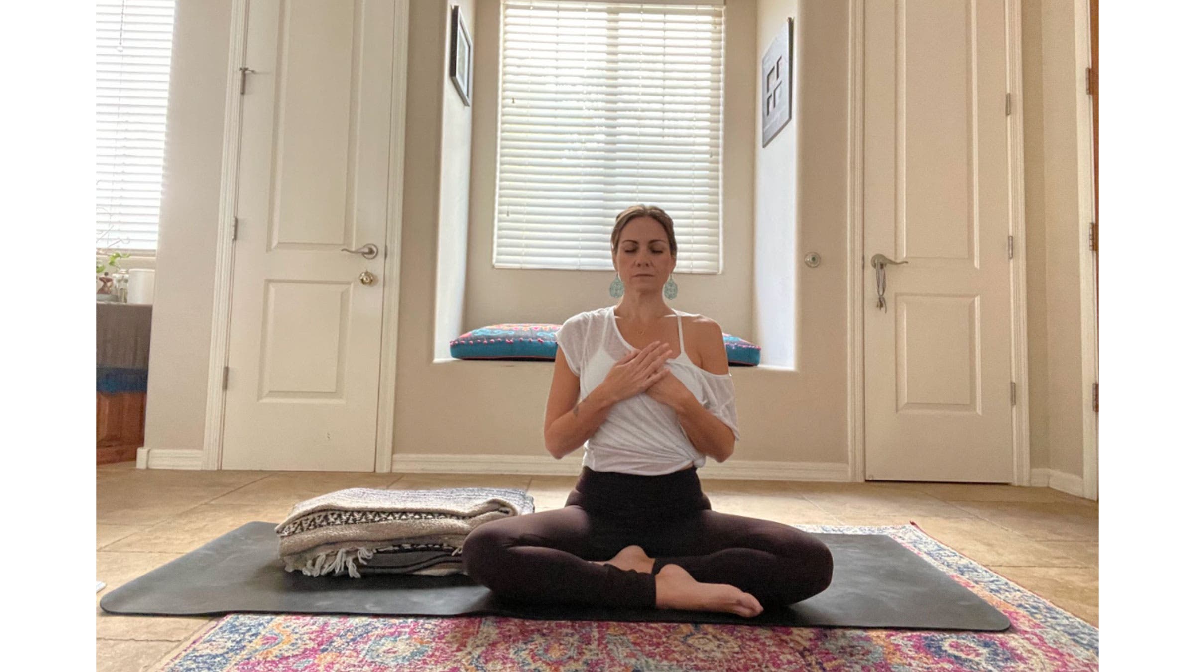 For this heart- and hip-opening practice, you’ll need two or three throw-size blankets. You may also use a bolster, pillows, blocks, extra blankets, eye pillows, or anything else that will help you feel supported. More support is always good.