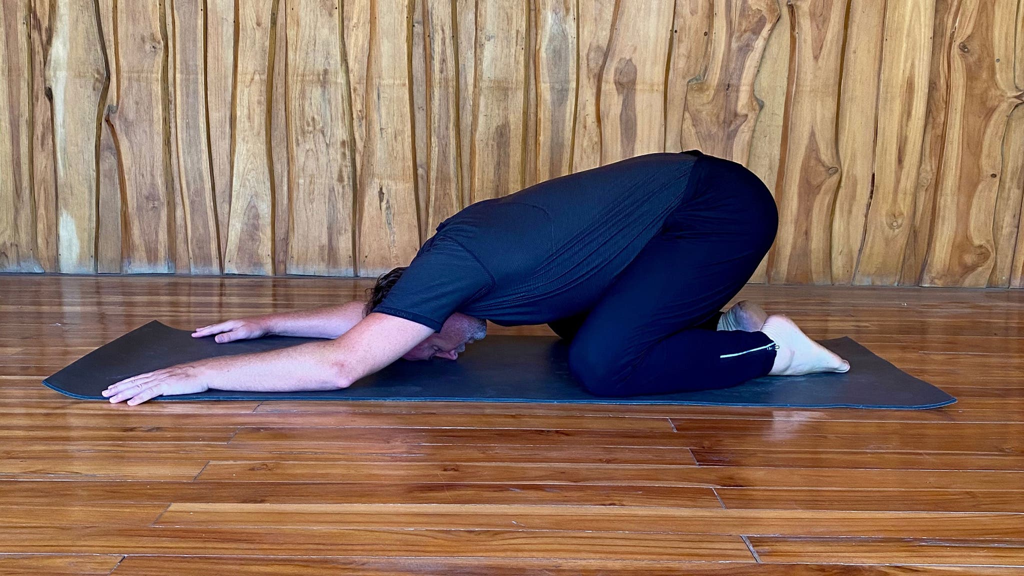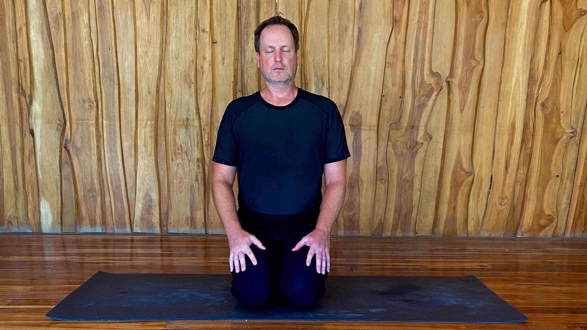 Set the tone for your practice by starting slow and committing to your breath and your intention. Kneel down on your mat, spread your knees wide and release your torso down, allowing your forehead to rest on your mat or on a prop. Take 10 deep breaths.