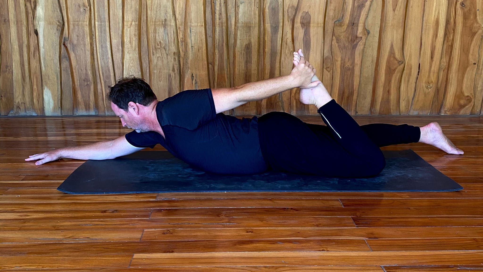 Lie flat on your belly. Move into a Sphinx Pose, with your forearms on the mat. Bend your right knee and reach back and catch your foot with your right hand. You can use a strap to catch your back foot. Kick your foot away from your body by pressing your foot into your hand or the strap, if using. You can also place a bolster or cushion under your hip points. Hold for 5–10 breaths. Repeat on the other side.