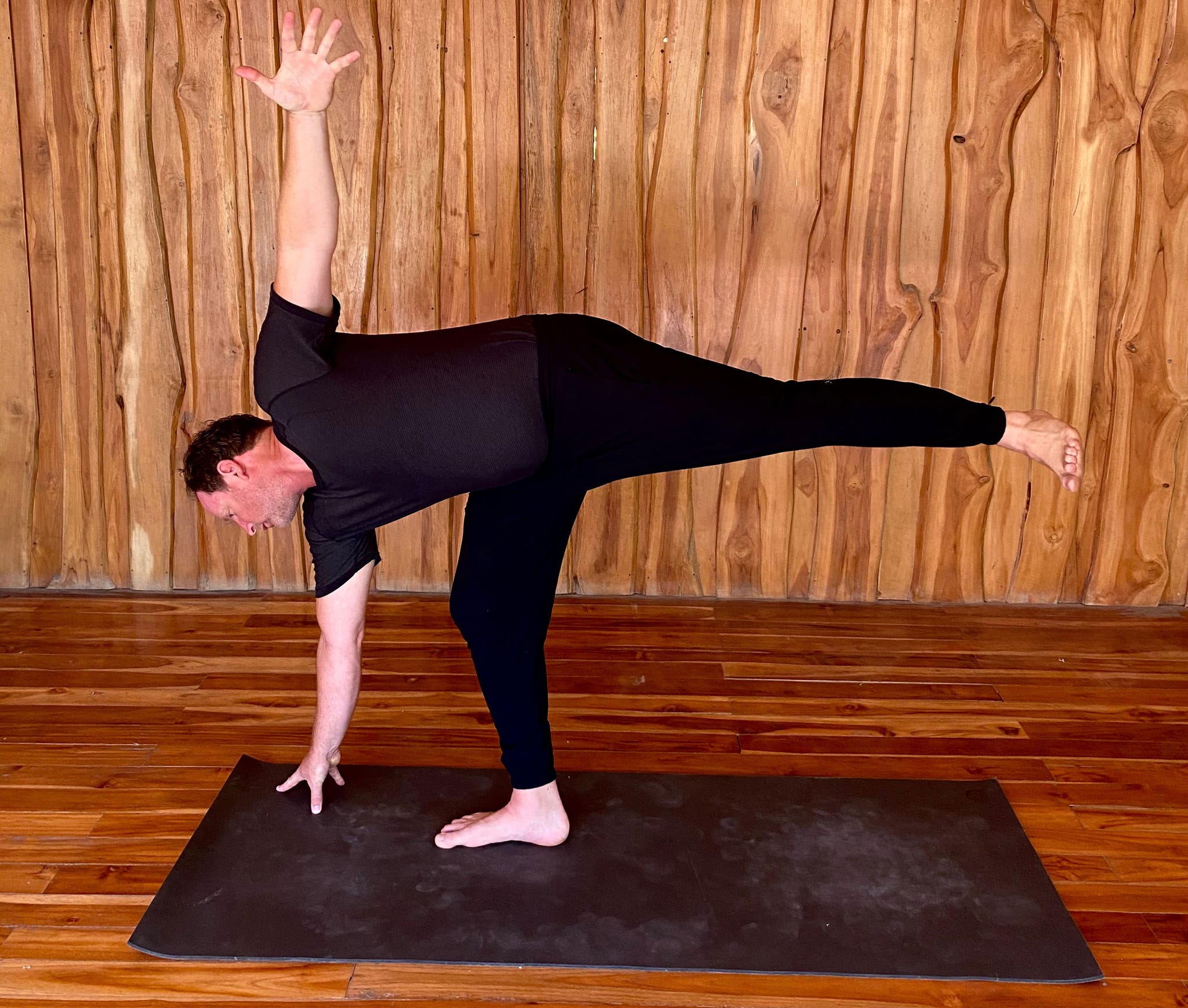 Place your right hand on the floor or on a yoga block about a foot in front of your right foot. Line up your thumb with your baby toe. Ground down through your standing leg. Keep both of your feet active as you lift your left leg up. Open your hips and chest to the left side. Set your eyes to the floor, the wall, or to your upper hand. Hold for 5–10 breaths. Retrace your steps to release the pose. Repeat on the other side.
