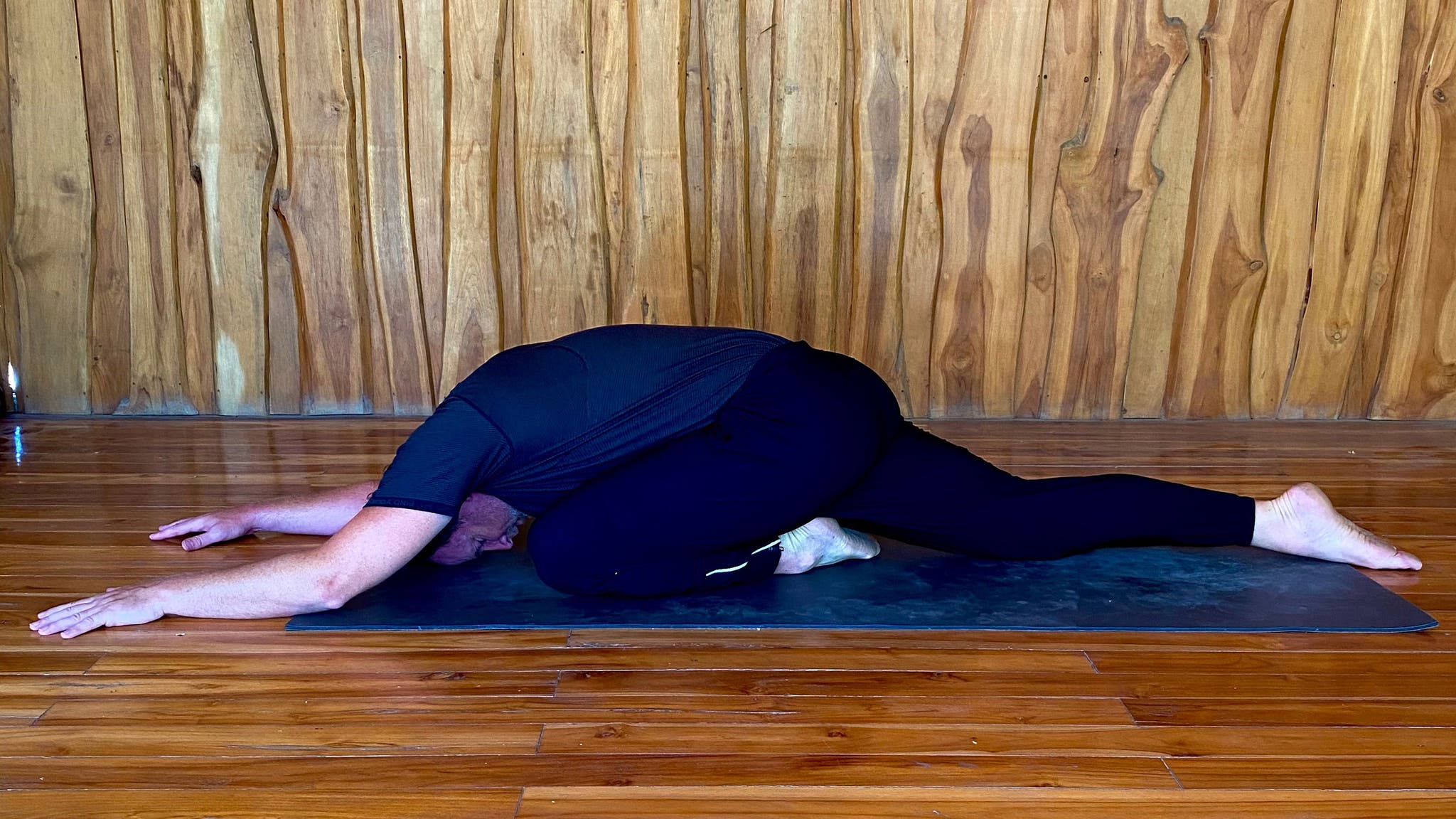 Stand in Tadasana at the center of your yoga mat. Step or just your feet into a wide standing straddle. Set your feet about 3 feet apart. Turn your right toes forward toward the short edge of your yoga mat. Dial your back foot in so your toes aim toward the top left edge of your mat. Unlike Triangle Pose, where our hips are more open, in this pose we square the hips and feet to the front edge of your mat. Hinge at your hips to fold your torso forward then down. Let your chest relax over your thigh. If you hamstrings or low back are feeling tight, bend your front knee and/or take a wider stance. Relax your head completely. Hold for 5–10 breaths. Repeat on the other side.