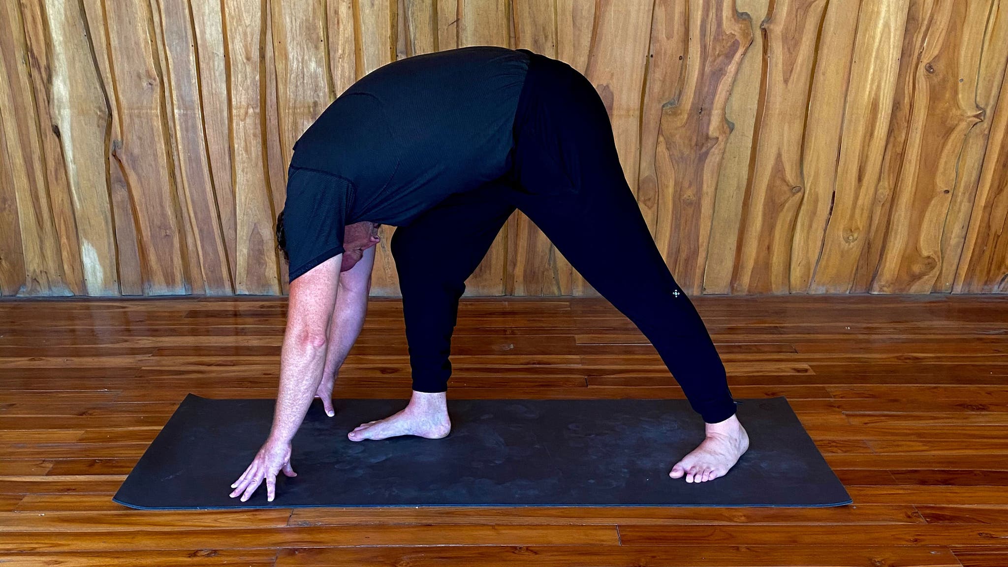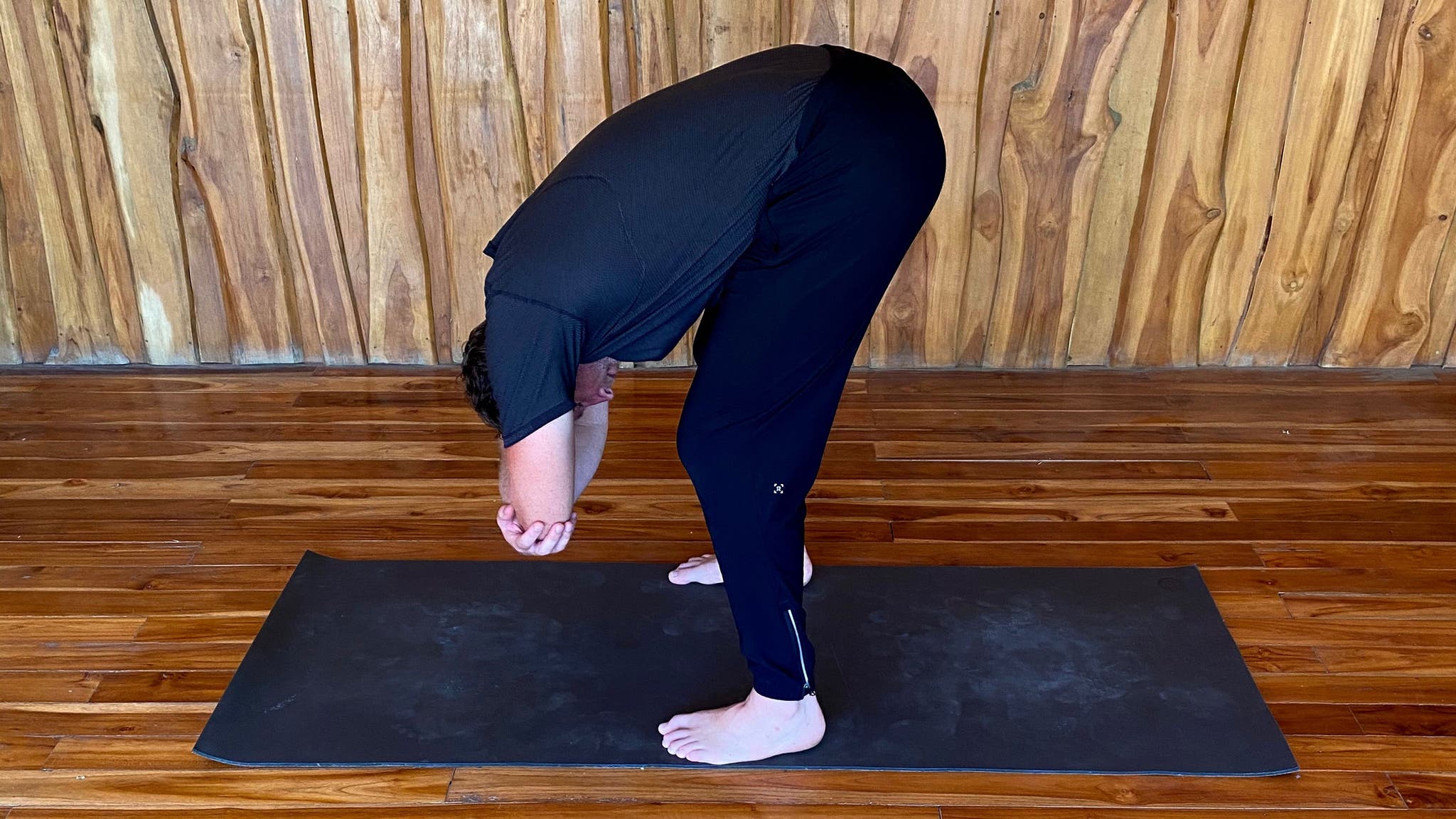 From Tadasana (Mountain Pose), set your feet about hip-width distance apart. Fold forward by hinging at your hips, and grab opposite elbows. Relax your head. Stack your hips over your ankles. Bend your knees as much as you need to. Hold for 5–10 breaths.