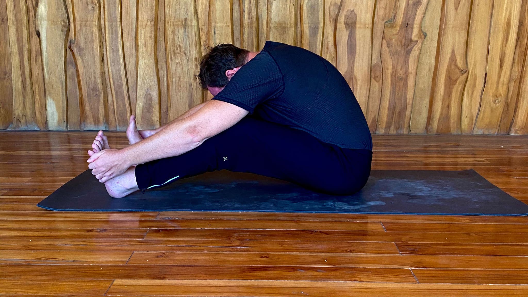 Find a tall seat. Extend your legs out. Flex your feet. Hinge at your hips as you fold your torso over your legs. Catch your feet with your hands or a strap. Bend your knees as much as you need to. Relax your shoulders down your back. As you inhale, lengthen your spine, as you exhale, relax deeper into the pose. Hold for 5–10 breaths.