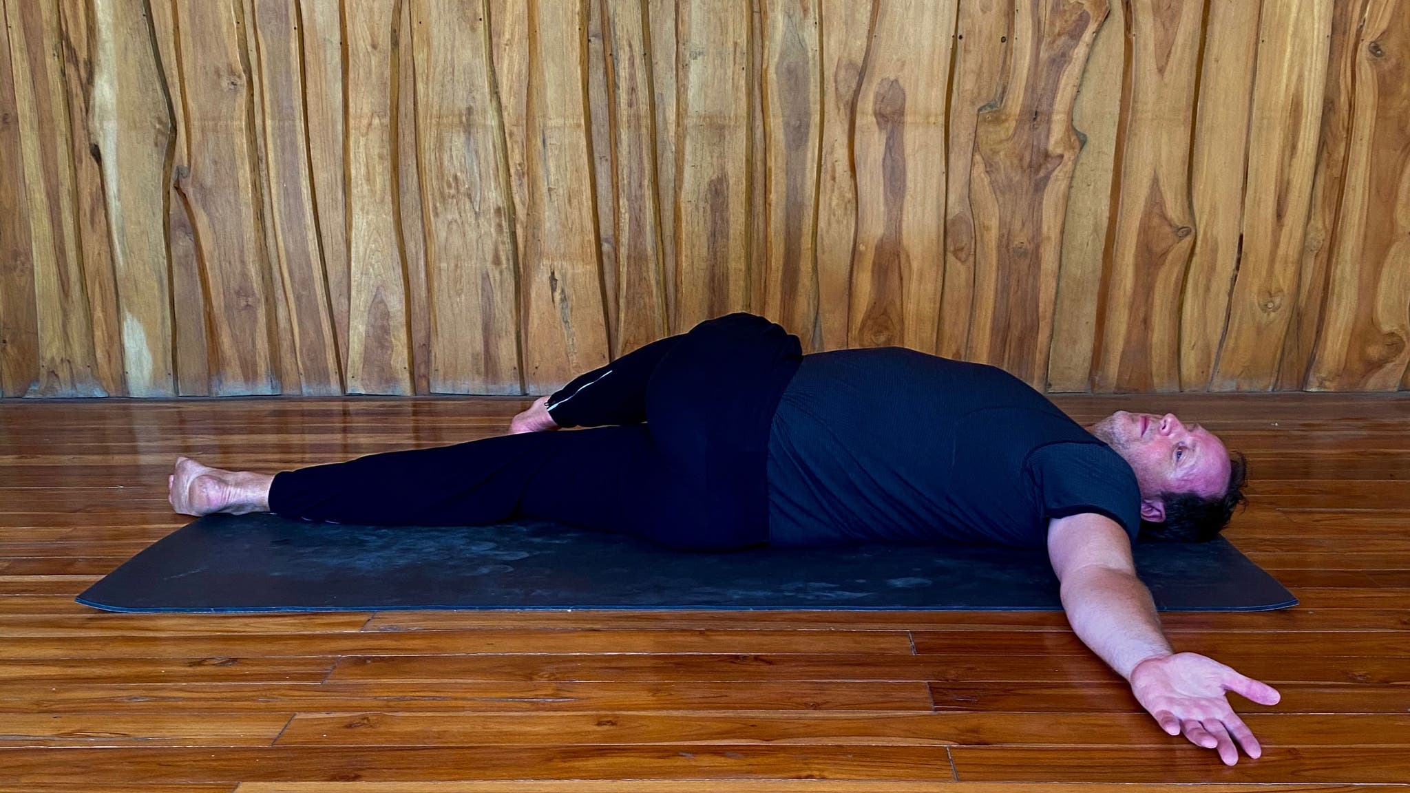 Lie on your back. Hug your left knee into your chest as you elongate your right leg. Move your left knee any amount over to the left. You can rest your left knee on a prop. Relax your shoulders toward the floor. Close your eyes. If it feels too intense, move your bent knee closer to the front of your mat. Hold for 5–10 breaths. Repeat on the other side.