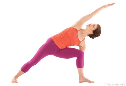 Exhale and place your right hand on the floor to the outside of your right foot. Extend the left arm over the left ear. Feel one continuous line from the left foot to the left fingertips.