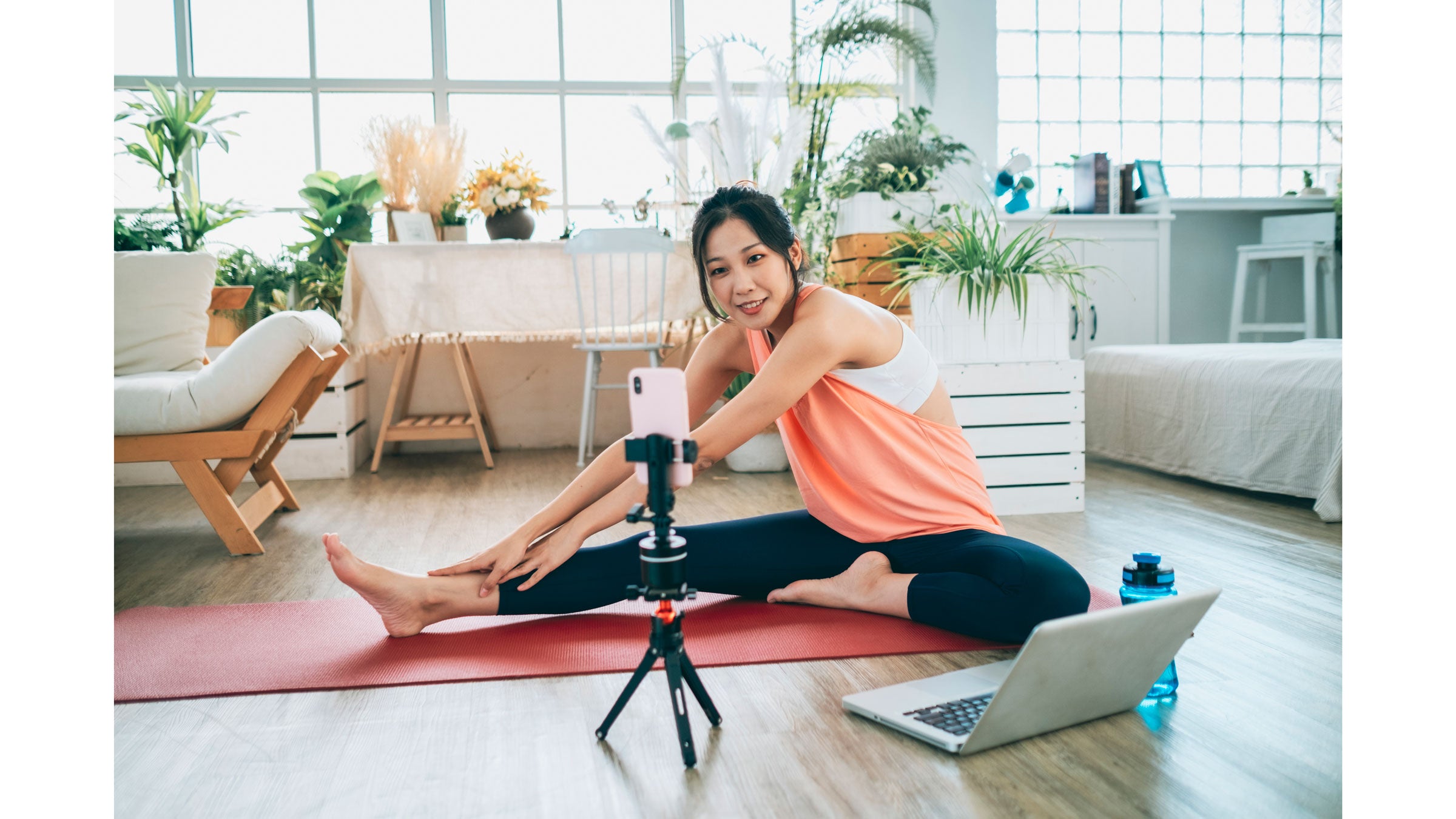 If you intend to teach interactively, you will still need the ability to hop into a demonstration from time to time. Set up your teaching space in a way that you can be close to the camera for observing students and that allows you to quickly step back onto your mat and be fully visible from head to toes.